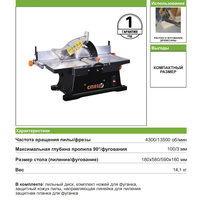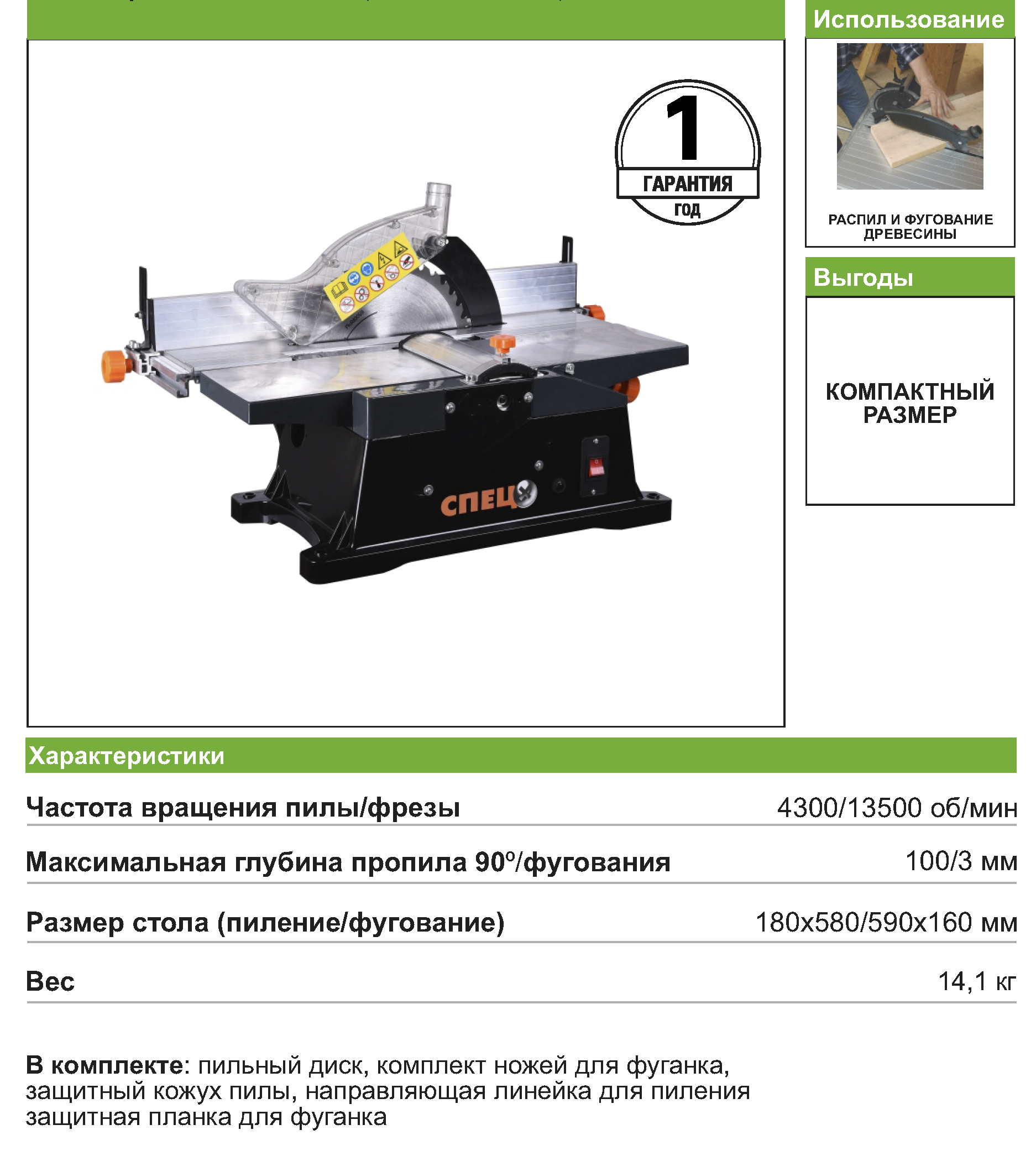 Посадочный диаметр диска: 30 мм; - Двигатель коллекторный, мощность: 2000 Вт; - Диаметр лезвия (пильный диск): 254 мм; - Длина стола (платформы): 580 мм, ширина: 180 мм; - Ширина режущей кромки: 150 мм; - Пиление под углом 90-135 градусов; - Комплект: станок распиловочно-строгальный, пильный диск, комплект ножей для фуганка, защитный кожух пилы, направляющая линейка для пиления, защитная планка для фуганка, инструкция, картонная упаковка.