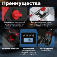 | Дополнительная информация | двухступенчатый редуктор с электронной регулировкой частоты вращения шпинделя, LED-подсветка рабочей зоны, быстрозажимной патрон и тиски, электронный дисплей, |