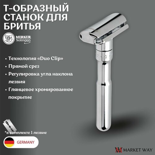 Станок для бритья MERKUR SOLINGEN, Т-образный, хромированный, прямой срез, регулировка угла наклона лезвия, лезвие в комплекте 1 шт, в картонной коробке