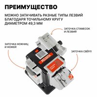 Устройство работает на базе коллекторного электродвигателя. Он является приводом для вращения заточного круга. Универсальный станок можно использовать для обработки лезвий самых разных типов, ширина которых может варьироваться в пределах от 6 до 51 мм. Агрегат пригодится для затачивания сверл, диаметр их может составлять от 3 до 10 мм.