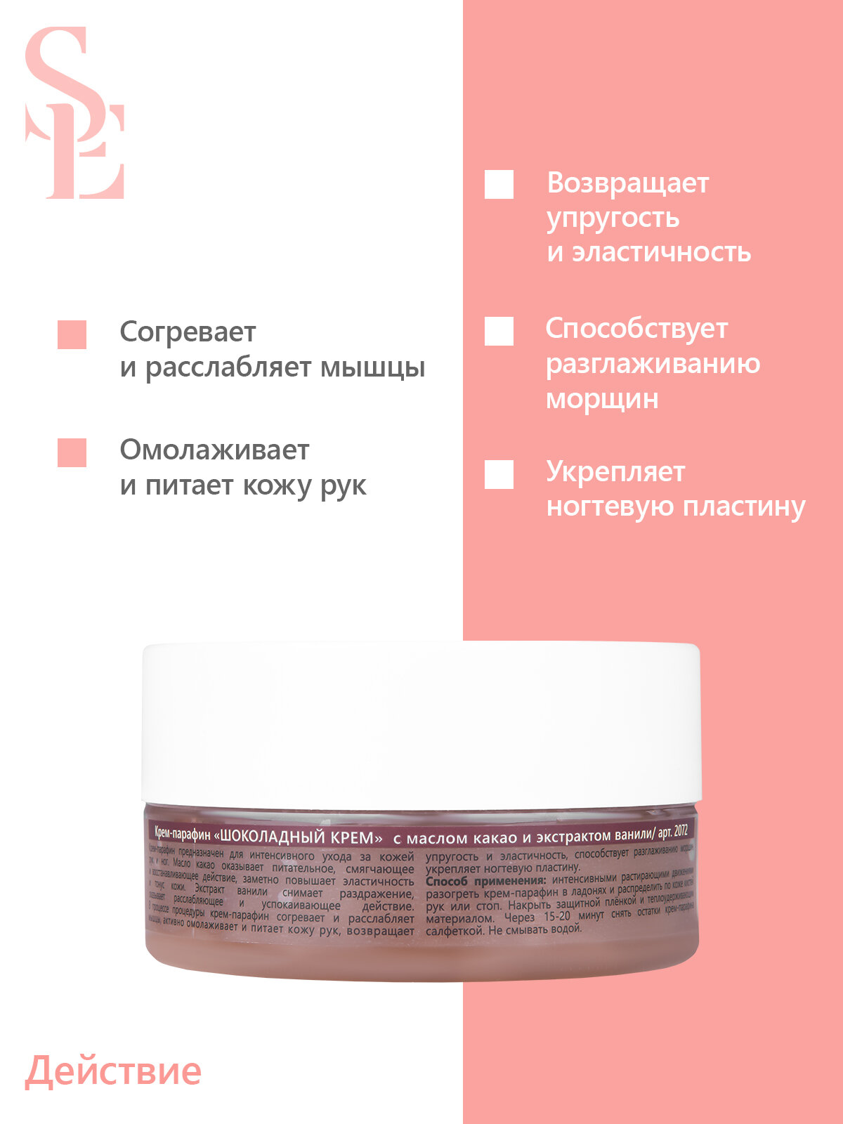 Крем-парафин предназначен для интенсивного ухода за кожей рук и ног. Масло какао оказывает питательное, смягчающее и восстанавливающее действие, заметно повышает эластичность и тонус кожи. Экстракт ванили снимает раздражение, оказывает расслабляющее, успокаивающее и противовоспалительное действие. В процессе процедуры крем-парафин согревает и расслабляет мышцы, активно омолаживает и питает кожу рук, возвращает упругость и эластичность, способствует разглаживанию морщин, укрепляет ногтевую пластину.