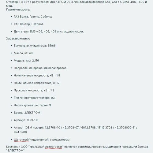 Стартер 1,8 кВт редукторный электром 93.3708 для автомобилей ГАЗ, УАЗ дв. ЗМЗ 405, -406, -409 и мод.