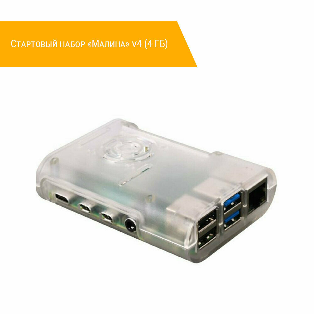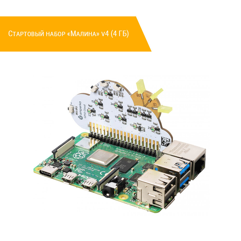 Сердце набора — микрокомпьютер Raspberry Pi 4 Model B (4 ГБ) размером с банковскую карту. На борту вы найдёте привычные компоненты: процессор, оперативную память, два порта Micro-HDMI, четыре USB, Ethernet, модули Wi-Fi и Bluetooth.