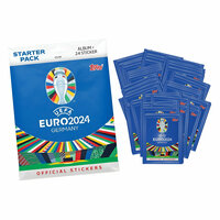 В наборе стартер пак, состоящий из альбома и 24 наклеек и 50 пакетиков наклеек коллекции "Topps EURO 2024". Каждый пакетик содержит 6 случайных наклеек.