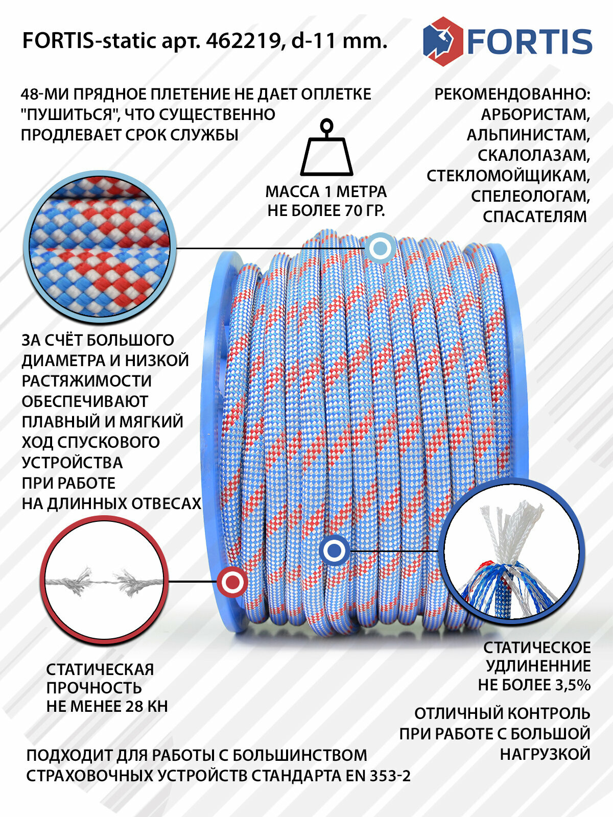 Высокопрочная веревка с оплёткой Fortis Static 462219, диаметром 11 мм, разрывная нагрузка 28 кН. Тип А. Предназначена для использования при подъеме, спуске или же страховке людей при выполнении работ промышленного альпинизма, скалолазании, строительстве, туризме и спелеологии. Так же Fortis Static хорошее решение для использования в быту или для организации активного отдыха на природе. Например, как фал для автомобиля, крепления и стяжки грузов, организаций веревочных лагерей или полос препятствий, навески качелей, тарзанок или организаций переправ на речках и т. п. ТР ТС019/221 Цвет и узор могут отличатся от представленного фото, в зависимости от партии.