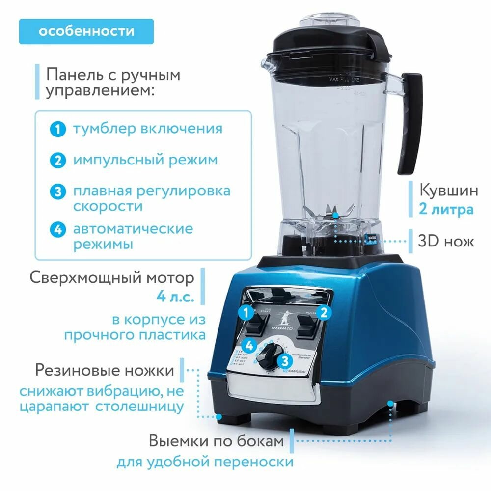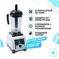 Профессиональный блендер Dream Samurai в белом цвете. Характеристики: мотор 2900 Ватт, нож с 4 лезвиями и 2 типами заточки, кувшин из тритана (2л), крышка с толкателем, механическое управление. Подробное описание блендера, видео и отзывы покупателей доступны на сайте Madeindream. com.
