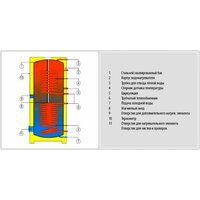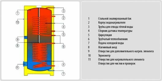 Резервуар водонагревателя сварен из стального листа, теплообменники - из стальной трубы, и все полностью покрыто эмалью, устойчивой к воздействию горячей воды. В качестве дополнительной антикоррозионной защиты в верхней части водонагревателя установлен магниевый анод, который регулирует электрический потенциал внутренней части емкости и таким образом уменьшает опасность его ржавления. В емкости приварены выводы горячей воды, холодной воды и циркуляционное отверстие. На водонагреватель надет пластиковый корпус (отвержденный полистирол).