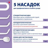 | Подробная комплектация | - Стационарный ирригатор; - Стандартная насадка для очистки межзубных промежутков – 2 шт.; - Наконечник для щетки - 2 шт.; - Ортодонтическая насадка для чистки брекетов – 1 шт.; - Ложка для чистки языка – 1 шт.; - Пародонтологическая насадка – 1 шт.; - Чехол для насадок – 1 шт.; - USB-шнур - 1 шт; - Адаптер; - Руководство по эксплуатации. |