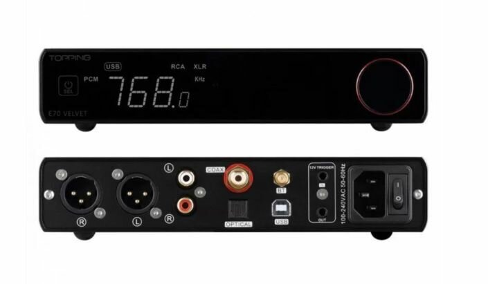 С E70 Velvet компания Topping предлагает новую версию превосходного ЦАПа E70, оснащенного новым высококлассным чипом цифро-аналогового преобразования AK4499EX от AKM. В остальном он использует превосходную техническую базу своего старшего брата, сочетая продуманный дизайн и высококлассные компоненты для исключительного звучания с продуманными и практичными функциями, такими как Bluetooth, триггер на 12 В или адаптируемый уровень выходного сигнала. E70 Velvet обеспечивает балансный XLR и односторонний RCA выход. Вход выбирается и позволяет задействовать только один или оба одновременно. Более того, Topping предлагает интеллектуальную функцию, позволяющую регулировать уровень этих выходов в зависимости от использования и желаемой интеграции. Так, уровень выхода XLR может быть изменен с 4 В до 5 В, а выхода RCA - с 2 В до 2.5 В. В Topping E70 Velvet встроен каскад цифро-аналогового преобразования на новом чипе ЦАП от AKM, AK4499EX, новом флагмане производителя. Этот преобразователь имеет архитектуру с переключаемыми резисторами, использующую фирменную технологию VelvetSound. В нем используются новейшие технологии высококачественного преобразования для обеспечения максимально яркого и реалистичного воспроизведения звука. Оснащенный чипом-приемником Qualcomm QCC5125 Bluetooth 5.1, E70 Velvet позволяет передавать музыку удаленно прямо со смартфона или планшета. Он также поддерживает кодеки передачи высокого разрешения aptX, aptX HD, aptX Adaptive и LDAC, гарантируя высококачественное воспроизведение по Bluetooth. Кроме того, E70 Velvet обходит стадию преобразования Bluetooth-приемника и использует более мощный ЦАП AK4499EX, чтобы обеспечить максимально точное воспроизведение звука. В E70 Velvet используется превосходная схема преобразования I/V, реализованная в его старшем брате. Она разработана для обеспечения низкого уровня искажений и шума, занимая при этом меньше места. Здесь она доведена до предела, чтобы позволить ЦАПу полностью раскрыть свой потенциал. USB-вход Topping E70 Velvet связан с интерфейсом последнего поколения XMOS XU316 с пользовательским драйвером Thesycon. Этот мощный интерфейс поддерживает аудиопотоки высокого разрешения, вплоть до PCM 32bit 768 кГц и DSD512, что обеспечивает очень высокое качество прослушивания.
