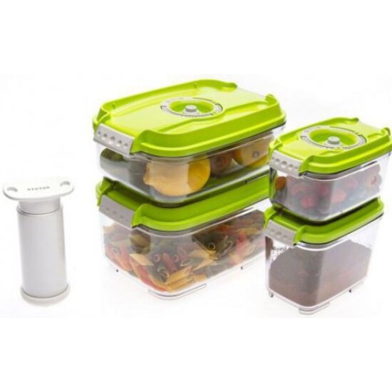 Тип: Набор контейнеров; Назначение: для вакуумного упаковщика; Количество в комплекте: 4; Особенности и характеристики: Промо набор вакуумных контейнеров с подарком, , Комплектация: контейнеры 0,5 л, 0,8 л, 1,4 л, 2,0 л, + ручной насос в подарок, , Благодаря использованию вакуумных контейнеров, продукты не подвергаются внешнему воздействию и срок хранения значительно увеличивается. Продукты сохраняют свои вкусовые качества и аромат, а запахи в холодильнике не перемешиваются, , Контейнеры для хранения продуктов в вакууме, Прочный хрустально-прозрачный Tritan™ BPA-Free, Прямоугольная форма контейнеров, Индикатор даты (месяц, число), Сделано в Словении, , Допускается замораживание (до -21 °C), мойка контейнера в ПММ, разогрев в СВЧ (без крышки), , Рекомендовано хранение следующих продуктов: фрукты, овощи, хлеб, колбасы, сыры, сладости, соусы, супы; Размеры: Размер упаковки (ДхШхВ), см 32 x 24 x 14; Вес: 1,83