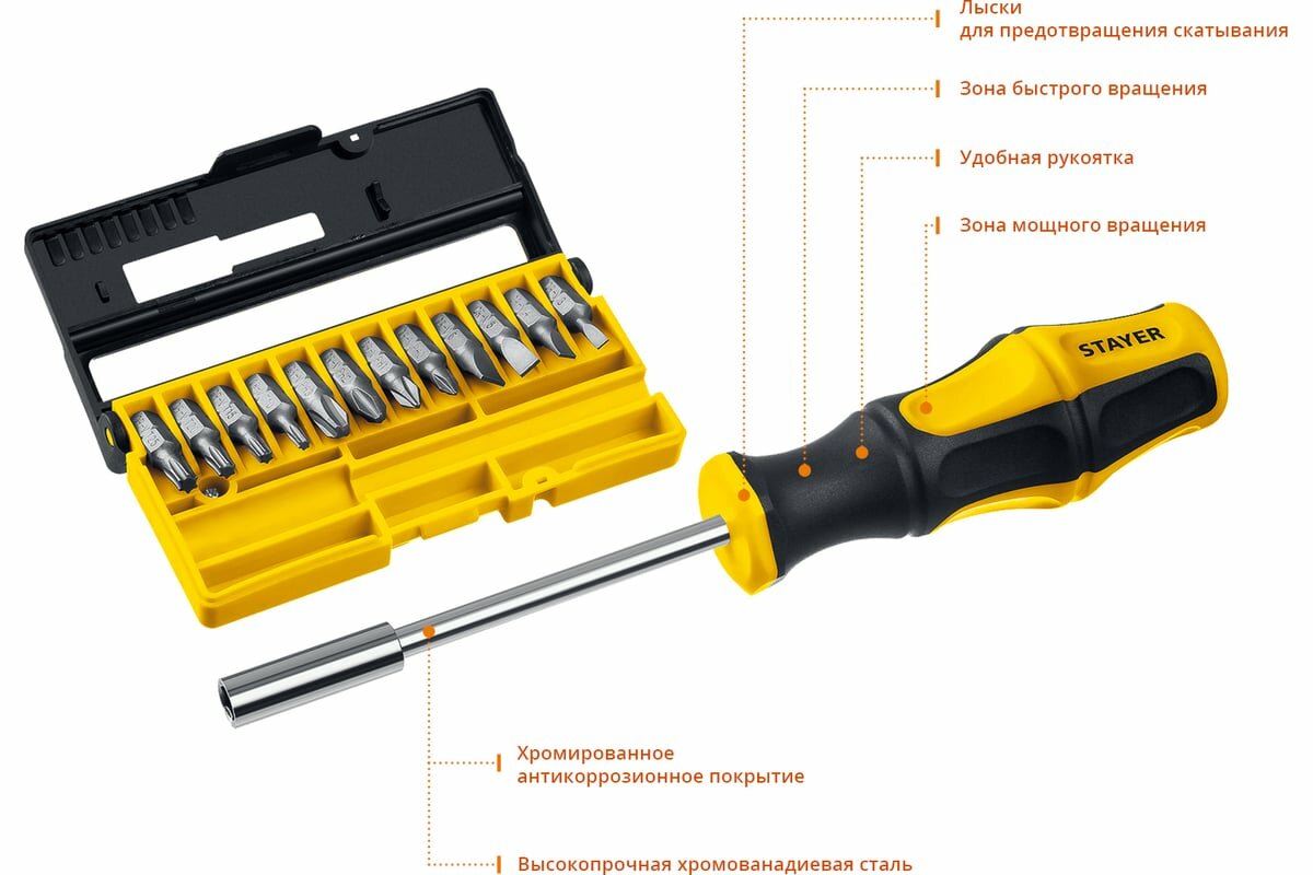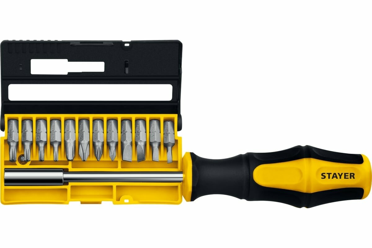 Stayer Набор: Отвертка-битодержатель «MASTER» HERCULES Cr-V сталь, двухкомпонентная рукоятка 13 предметов 25813: сравнение цен, характеристики, фото, актуальное наличие и цены.