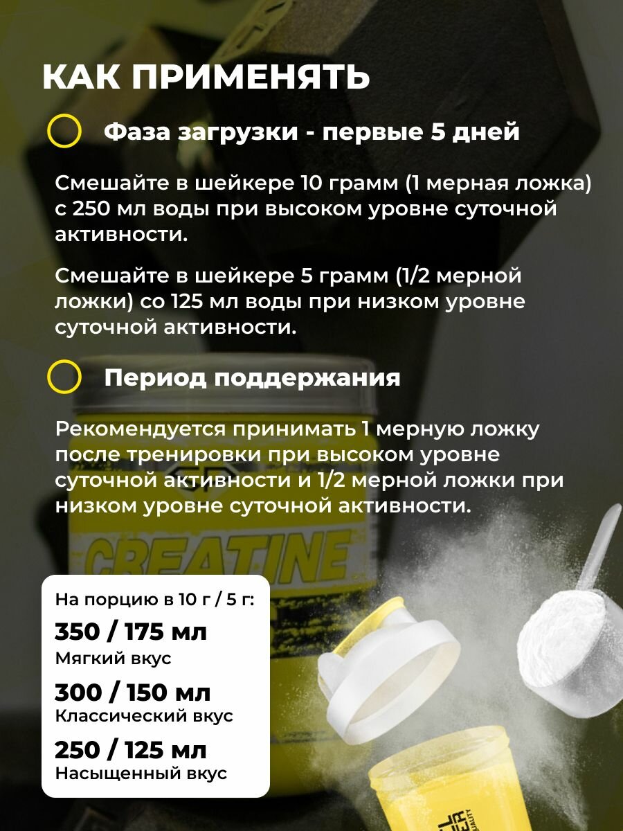 | Дополнительная информация | Рекомендации по применению: В фазе загрузки (первые 5 дней) рекомендуется принимать по 1 скупу - 10 грамм два раза в день, смешав с 250 мл воды или вашего любимого напитка. В период поддержания рекомендуется принимать 1 скуп после тренировки. |