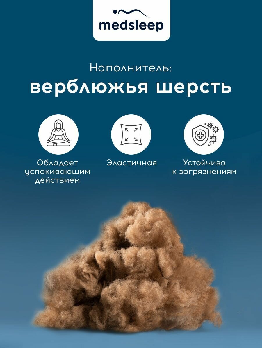 Пух австралийского верблюда имеет полую структуру и хорошо впитывает влагу, поэтому она легче и теплее многих наполнителей. Изделие из верблюжьей шерсти дышит. Материал благоприятно воздействует на человека, снимая нервное напряжение, расслабляя мышцы и нормализуя кровообращение. Шерсть способна снимать статическое электричество. Прочный чехол отличается высокой гигроскопичностью. Плотный хлопок-тик с особым плетением нитей дополнительно изолирует мелкие частички наполнителя, не позволяя им проникать наружу.