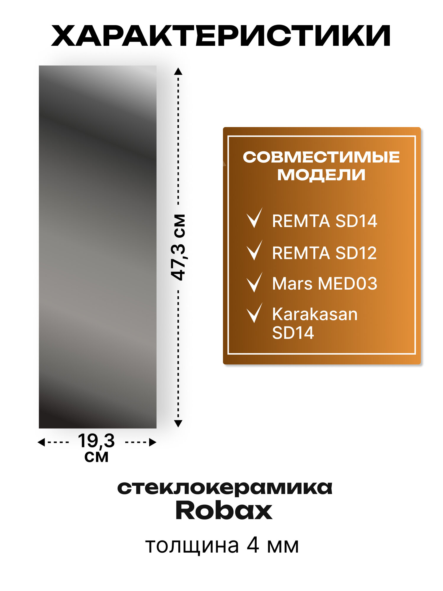 огнеупорное 720 градусов! Размер стекла 47,3 на 19,3 см Стеклокерамика Robax толщина 4 mm Производство: Германия Совместимые модели: Remta SD14, Remta SD12, Mars MED03, Karakasan SD14 Стекло упаковано в надежную деревянную обрешетку и гарантированно доедет в целости и сохранности!