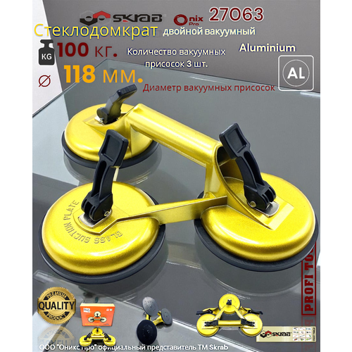 Тройные алюминиевые стеклодомкраты представляют собой металлическую рукоятку с 3-я вакуумными присосками с фиксаторами. Тройные стеклодомкраты с алюминиевым корпусом SKRAB 27063 выдерживают нагрузку до 120 кг и используются для перемещения, снятия и установки тяжелых стекол, оргстекла, кафельной плитки, листового металла и любых других гладких поверхностей. Тройные стеклодомкраты широко используются не только при производстве окон и дверей, но и в строительстве, автомобильной промышленности, в быту (например, для переноски стеклянного стола). Вакуумные присоски для стекол с алюминиевым корпусом SKRAB хорошо зарекомендовали себя при профессиональном применении на заводах, производствах стеклопакетов прежде всего своей высокой надежностью, высоким качеством при низкой цене.