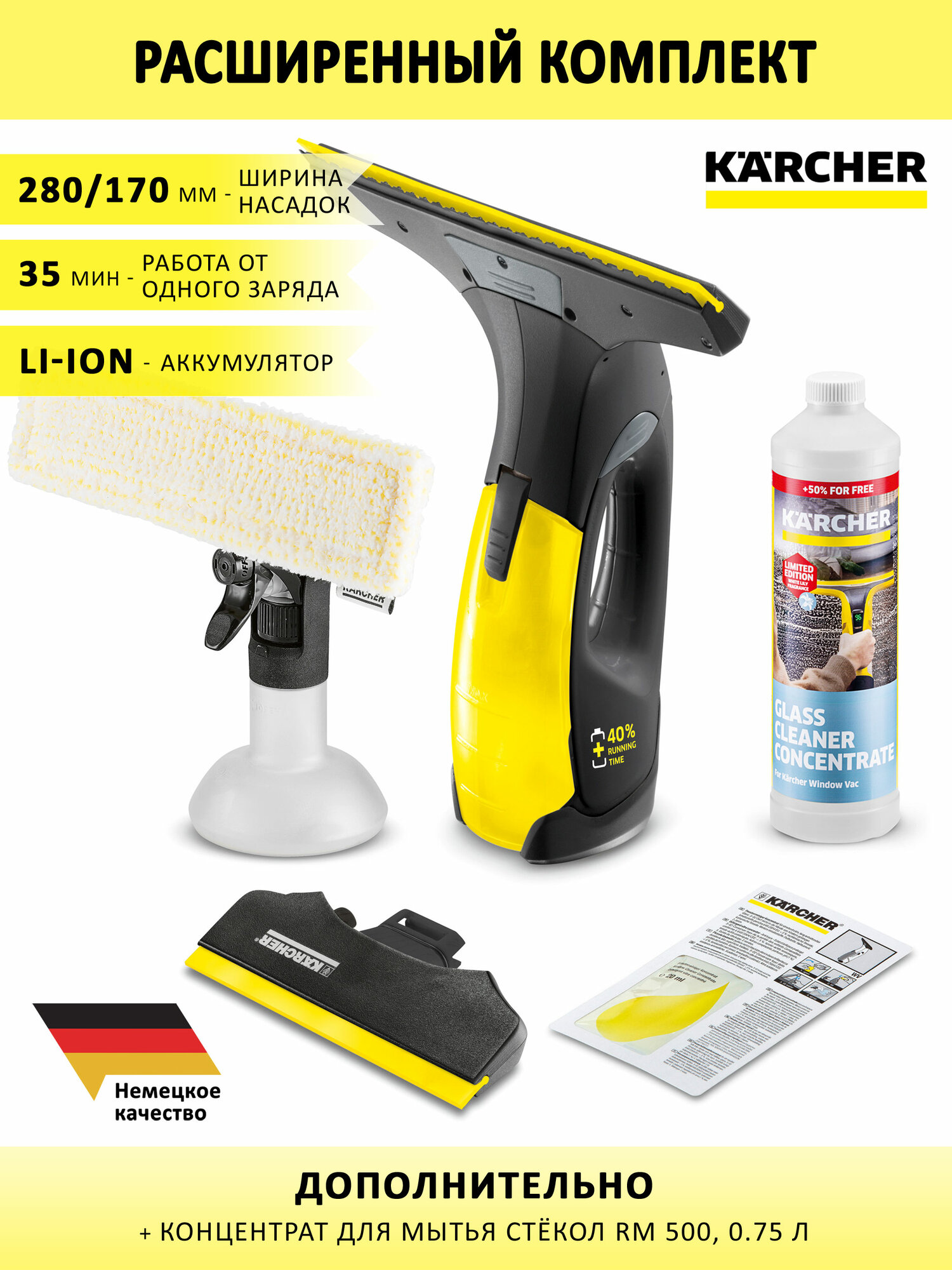 Стеклоочиститель (мойщик окон) Karcher WV 2 Black Edition, аккумуляторный + концентрат для мытья стекол RM 500, 0.75 л: сравнение цен, характеристики, фото, актуальное наличие и цены.