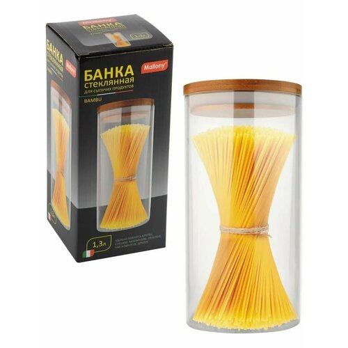 Стеклянная банка для сыпучих продуктов с крышкой Mallony BAMBU 1.3л. предназначена для хранения сыпучих продуктов. Бамбуковая крышка с прокладкой из силикона плотно закрывает банку, что обеспечивает надежную защиту содержимого от пыли и влаги. Изделие выполнено из стекла толщиной 2.3 мм, оно легко моется и не требует особого ухода. Можно мыть банку без крышки в посудомоечной машине