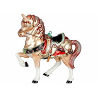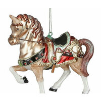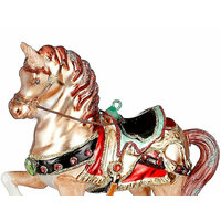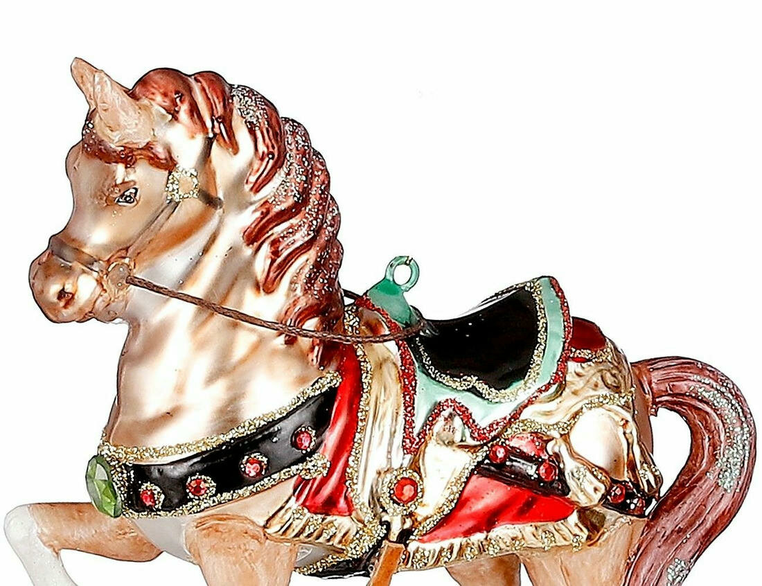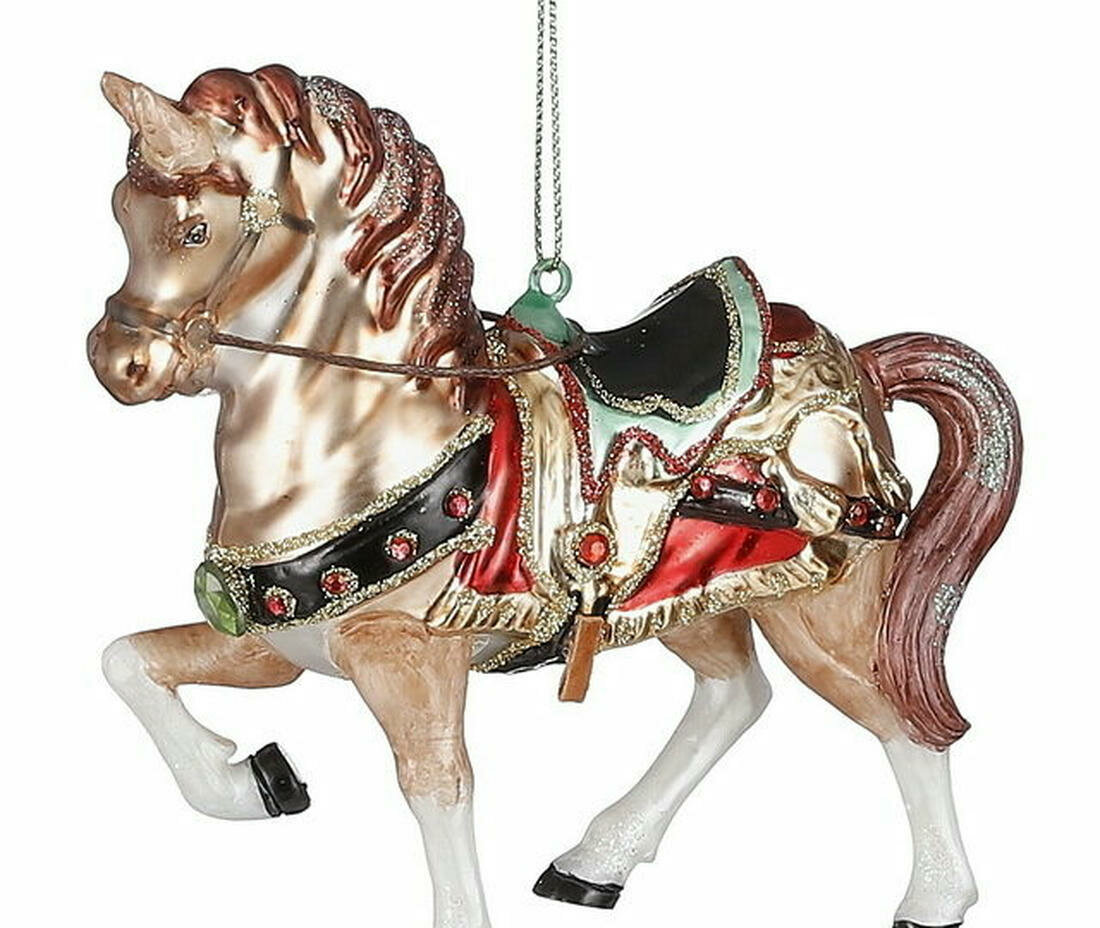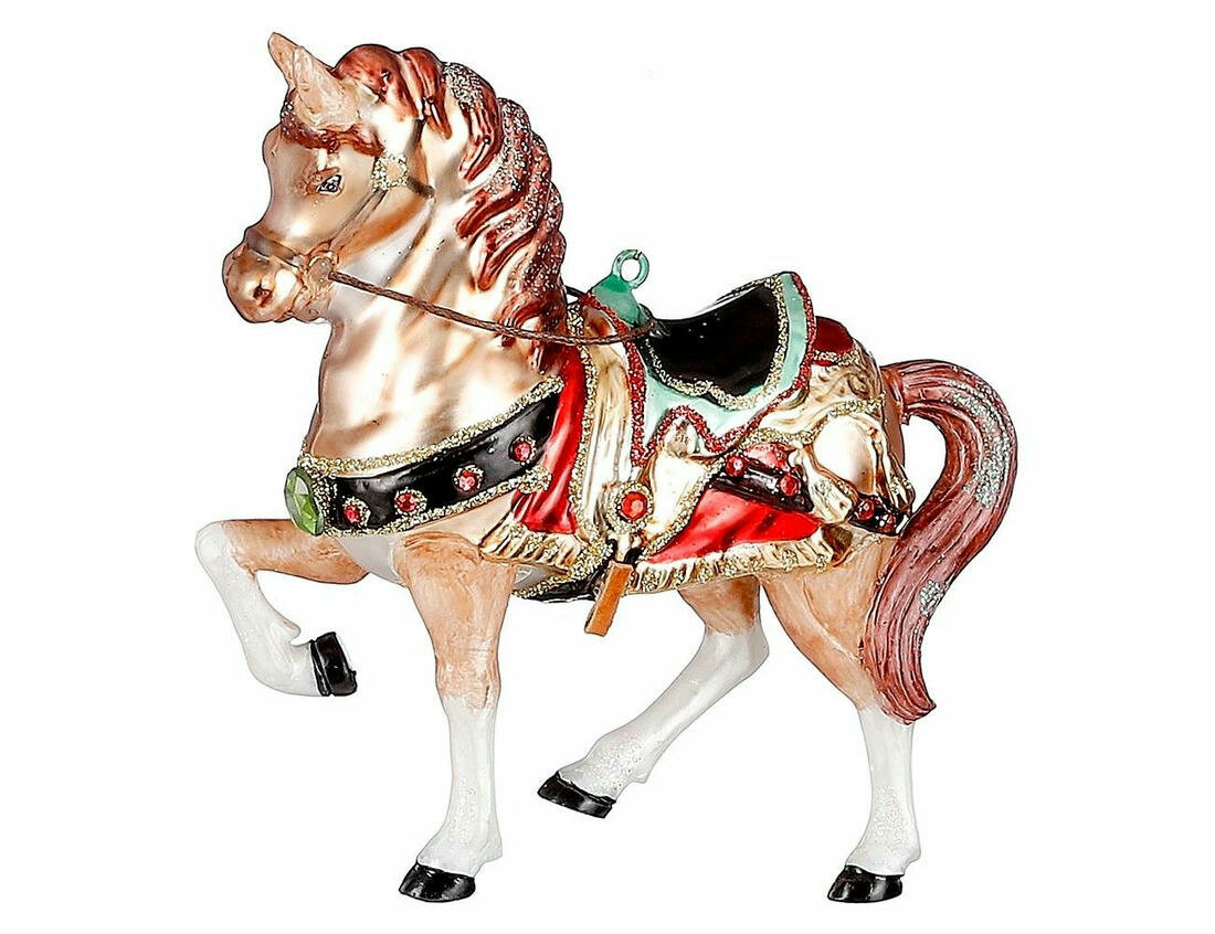 Грациозный конь в яркой праздничной амуниции чинно вышагивает навстречу Новому году - такая стеклянная елочная игрушка очарует всех ценителей эксклюзивного новогоднего декора! Глянцевое сияние, нежные оттенки и проработка каждой детали делают это украшение роскошной частью коллекции необычных елочных подвесок.