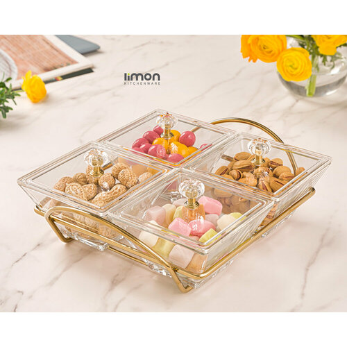 Менажница может использоваться как сервировочная посуда для сыра, орехов, оливок или специй. В комплекте поставляются четыре стеклянные менажницы с акриловыми крышками и одна деревянная подставка.