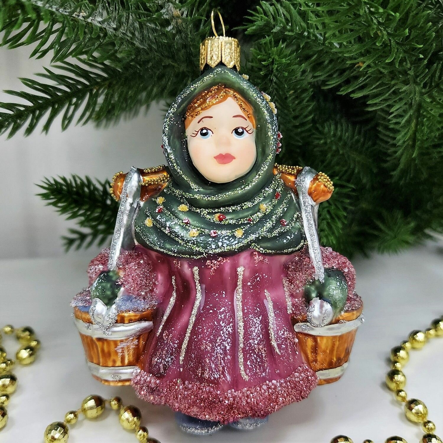 Стеклянная ёлочная игрушка "Девочка с коромыслом" от Irena-Co - это уникальное авторское украшение, которое станет ярким акцентом на вашей ёлке и создаст неповторимую атмосферу новогодних праздников.