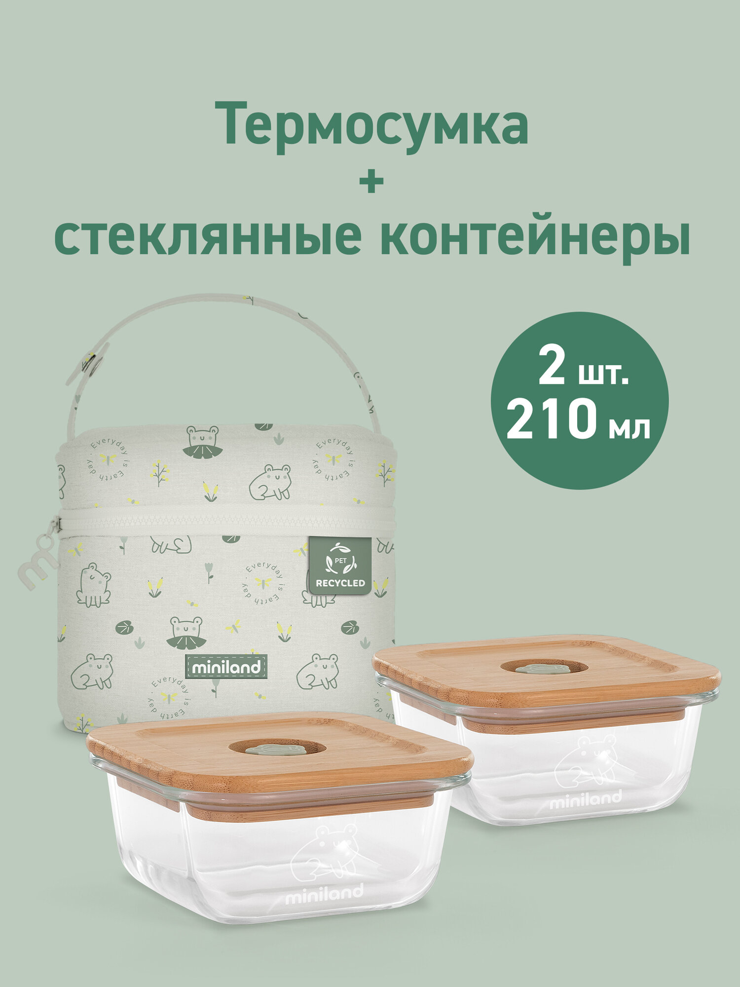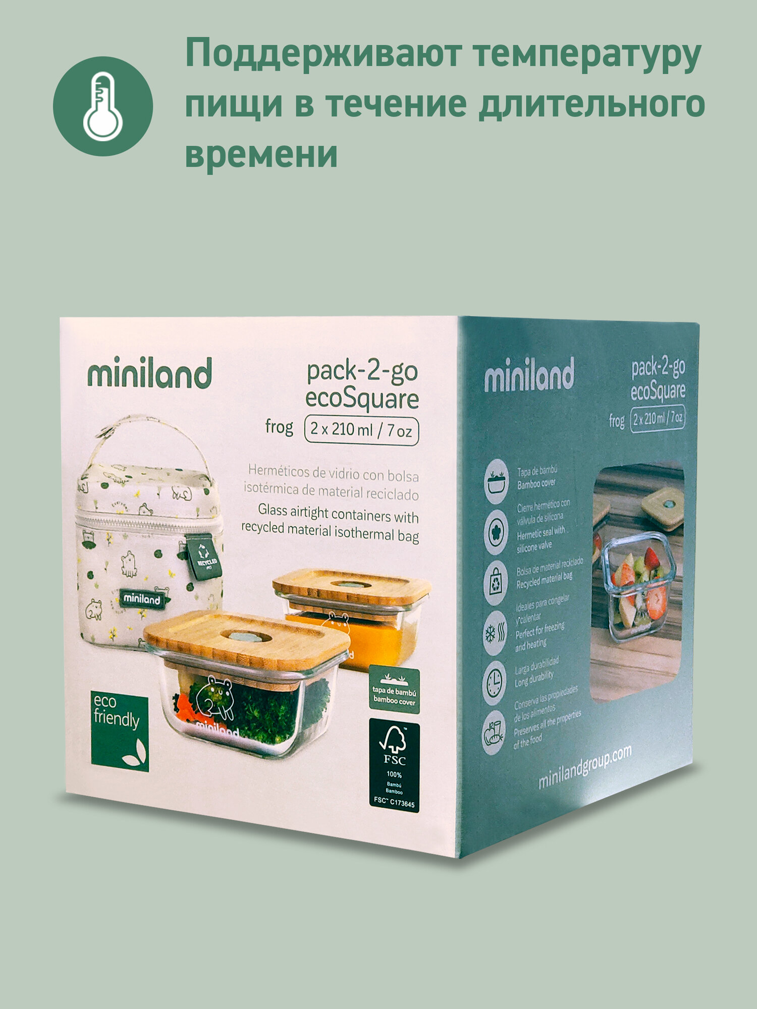 Стеклянные контейнеры (2х210 мл) с крышками и термосумкой Miniland Pack-2-Go Ecosquare для детского питания, лягушки: сравнение цен, характеристики, фото, актуальное наличие и цены.