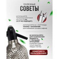 Сифон работает от современных стандартных баллончиков 8-8.6 грамм с углекислым газом CO2 (подходят все современные баллоны любых брендов и производителей)
