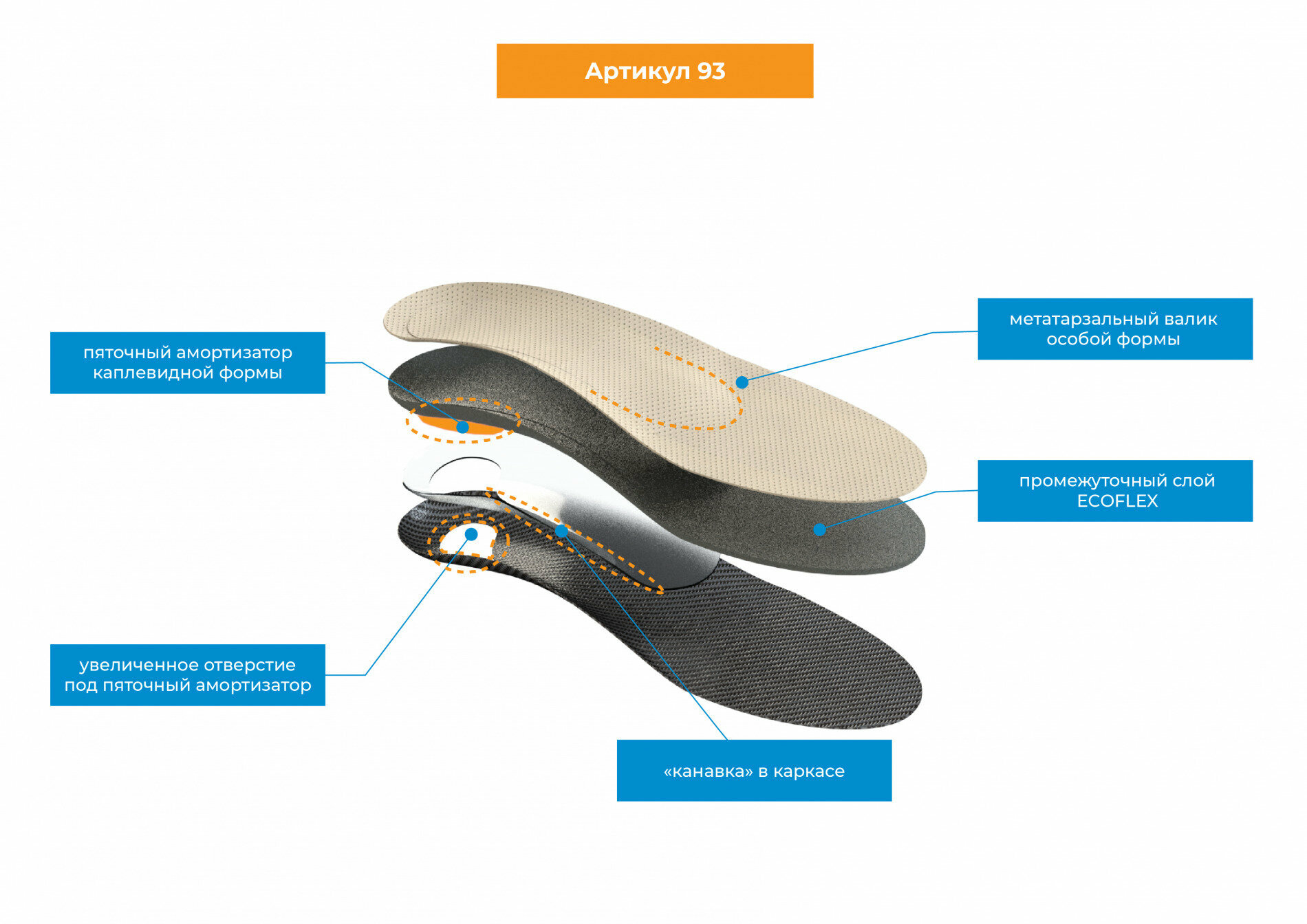 Верхние покрытие – Текстиль Средний слой и метатарзальный валик – Ecoflex Амортизатор – Ecoflex Нижний слой – оптик-карбон