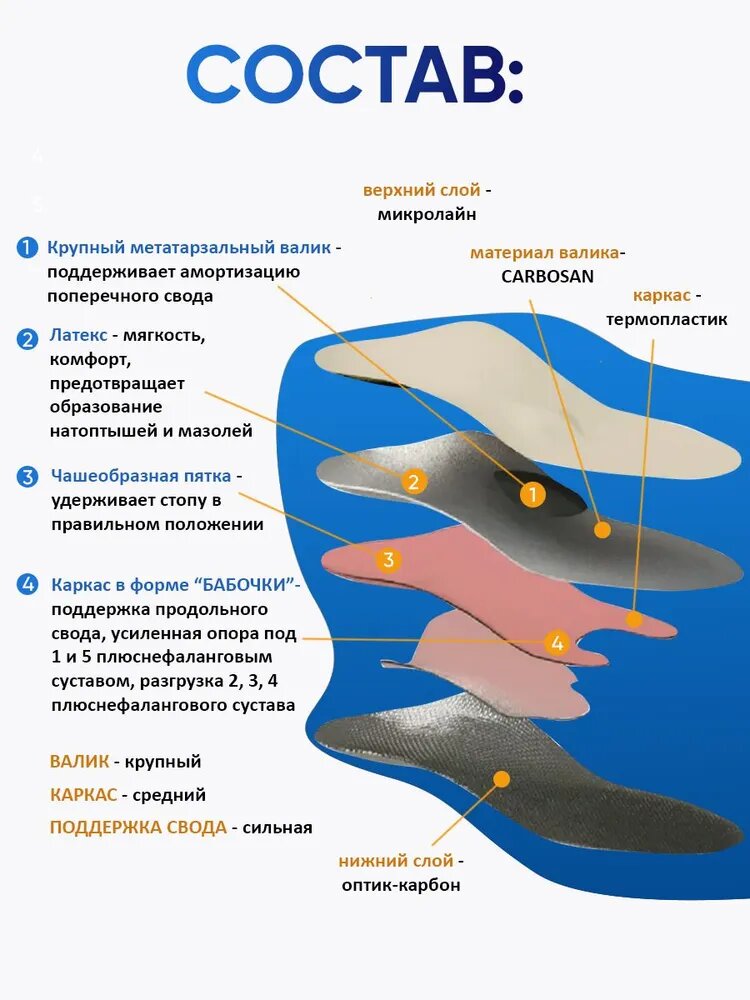 | Показания | артрит/артроз, беременность, вальгусная деформация, варикоз, варусная деформация, деформация нижних конечностей, дисплазия соединительной ткани, искривление позвоночника, лишний вес, натоптыши, повышенная нагрузка на ноги, полая стопа, поперечное плоскостопие, продольно-поперечное плоскостопие, продольное плоскостопие, пяточная шпора |