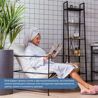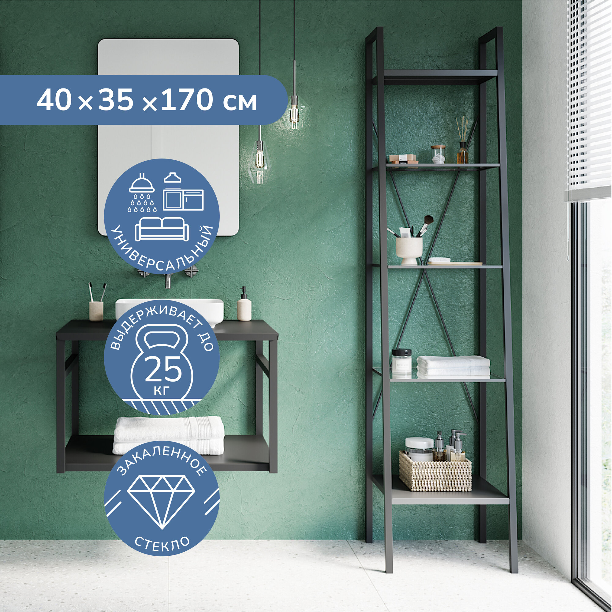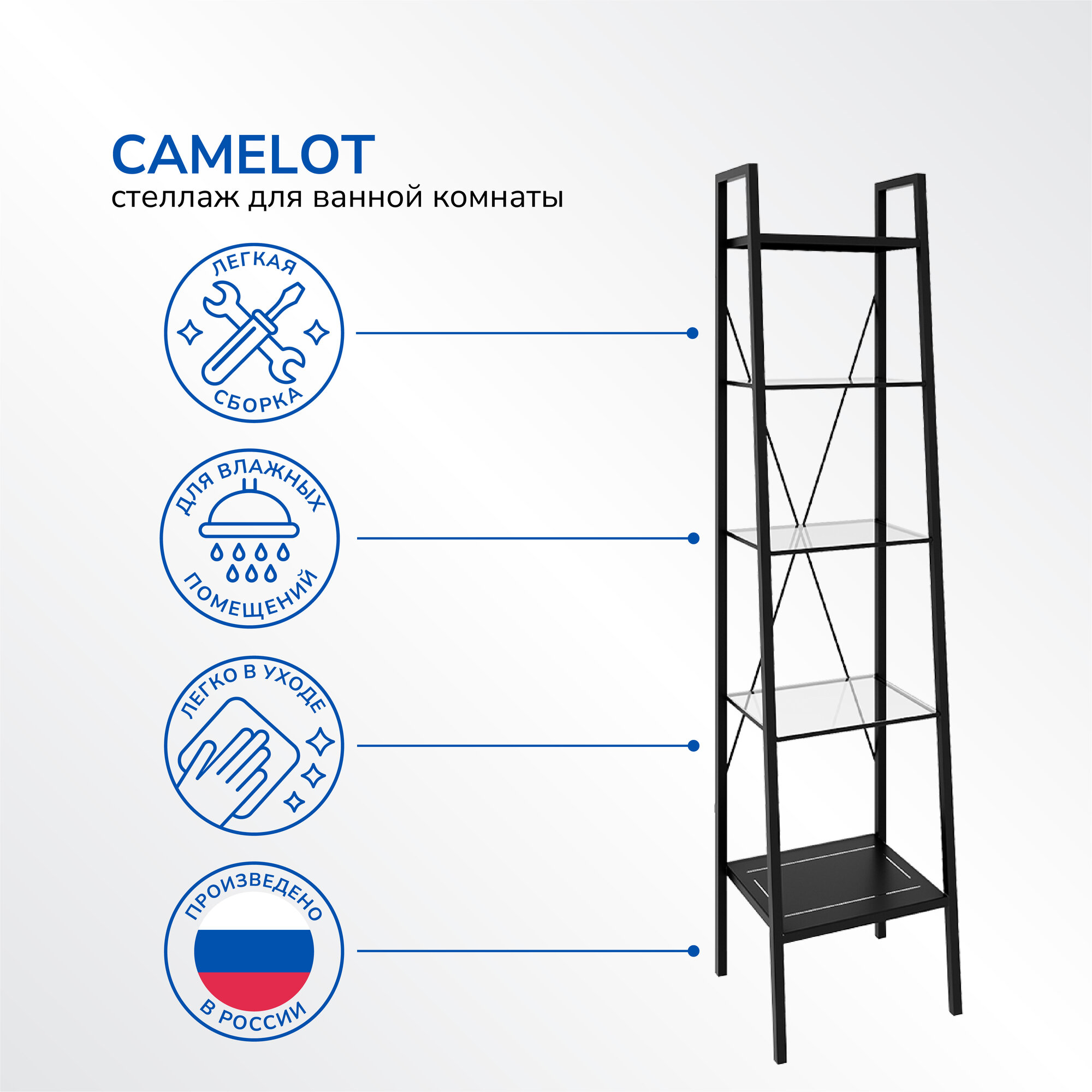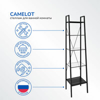 Металлическая мебель из коллекции Camelot идеально впишется в современный интерьер ванной комнаты. Стильный и практичный стеллаж с полками из закаленного стекла можно использовать как для хранения полотенец, косметических и гигиенических средств, так и для размещения элементов декора. Не привлекает к себе излишнее внимание, выглядит легким, поэтому визуально не загромождает пространство.