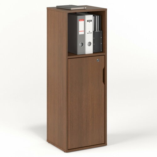 Особенностью данного стеллажа является его конструкция с дверкой и открытой полкой. Это позволяет удобно разместить книги, папки и другие предметы, а также обеспечивает быстрый доступ к ним.