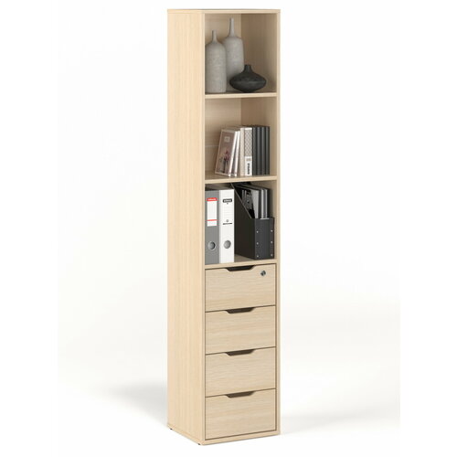 Особенностью данной модели является наличие ящиков и открытой полки. Это позволяет использовать стеллаж не только для хранения книг, но и для архивных папок, что делает его многофункциональным.