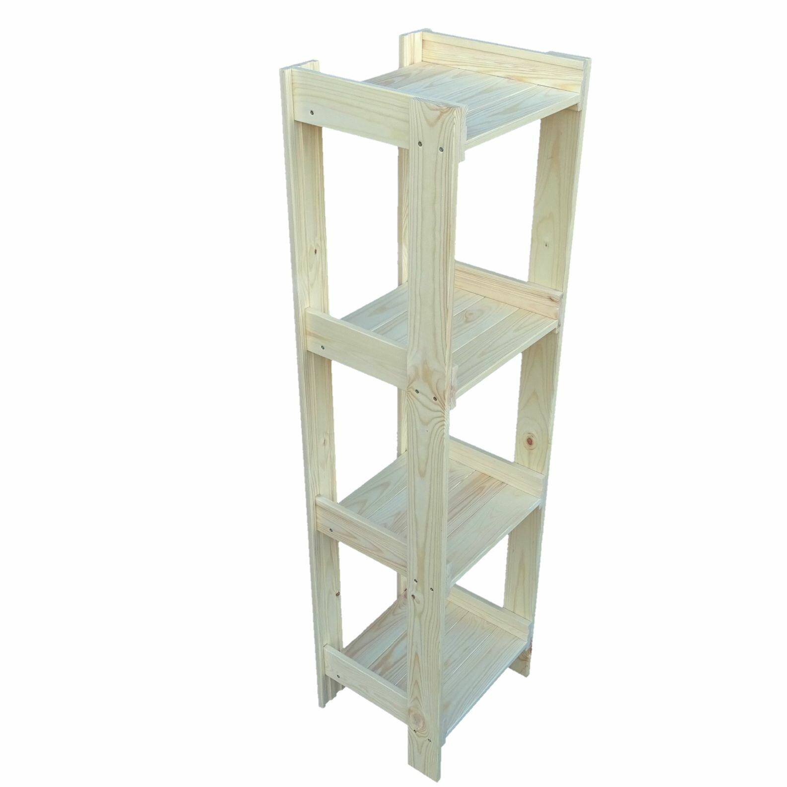 Стеллаж деревянный для дома с 4 полками. Предназначен для цветов, рассады, домашних растений, книг, хозяйственных принадлежностей. Выполнен из массива сосны. Детали цельные, не срощенные (т. е. не скленные из нескольких маленьких). Прочная конструкция стеллажа с пазами и вместе с тем лëгкая, не громоздкая.