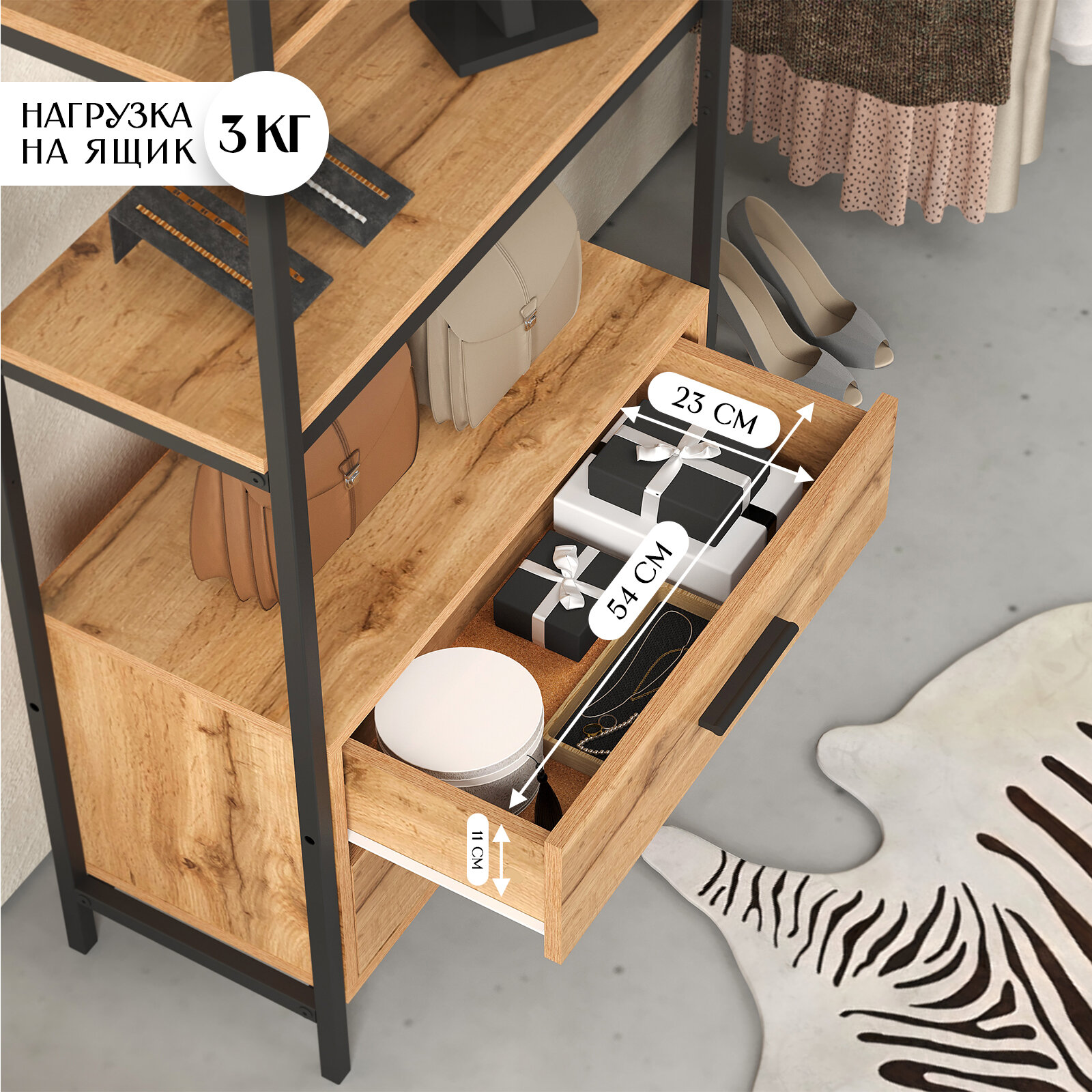Стеллаж оснащен двумя ящиками, что делает его еще более функциональным. Это позволяет удобно хранить мелкие предметы и аксессуары.