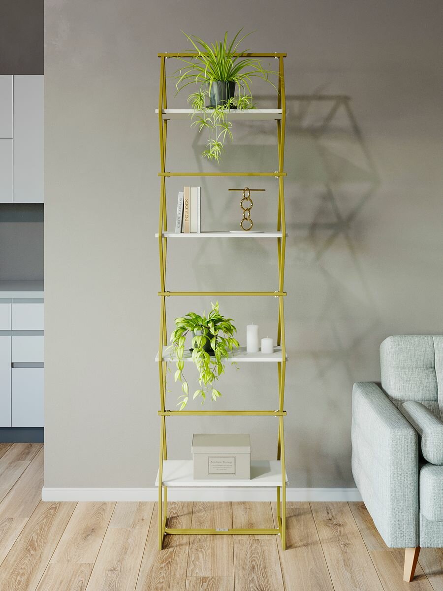 Металлический каркас обеспечивает прочность и надежность конструкции, а четыре полки позволяют разместить на них книги, игрушки, предметы интерьера или цветы.