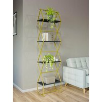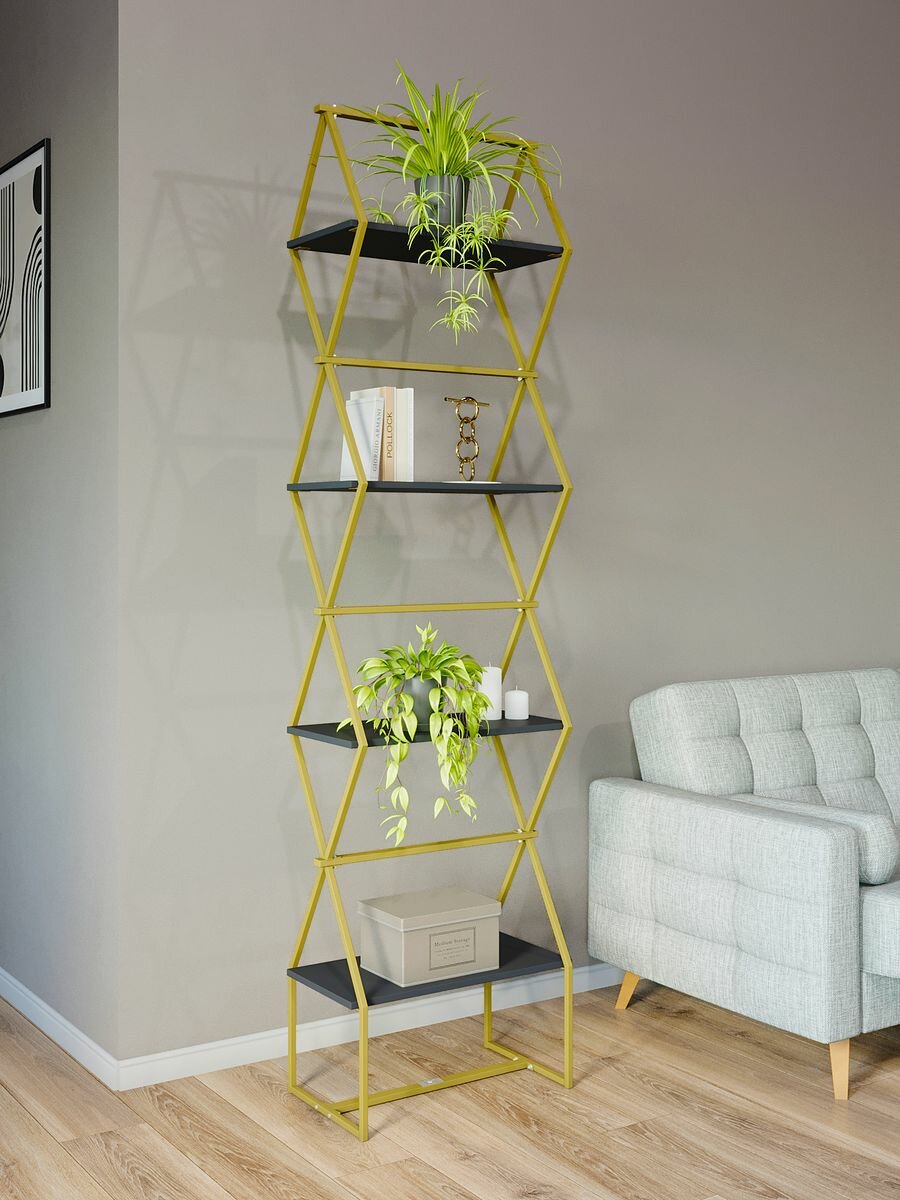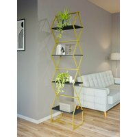 Стеллаж выполнен в стиле лофт, что придает ему особый шарм и индивидуальность. Золотой и черный цвета в сочетании с ромбовидным дизайном создают неповторимую атмосферу в вашем доме или офисе.