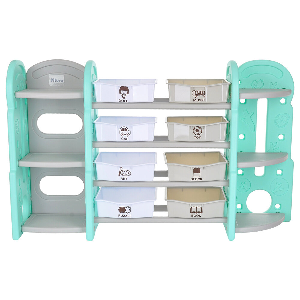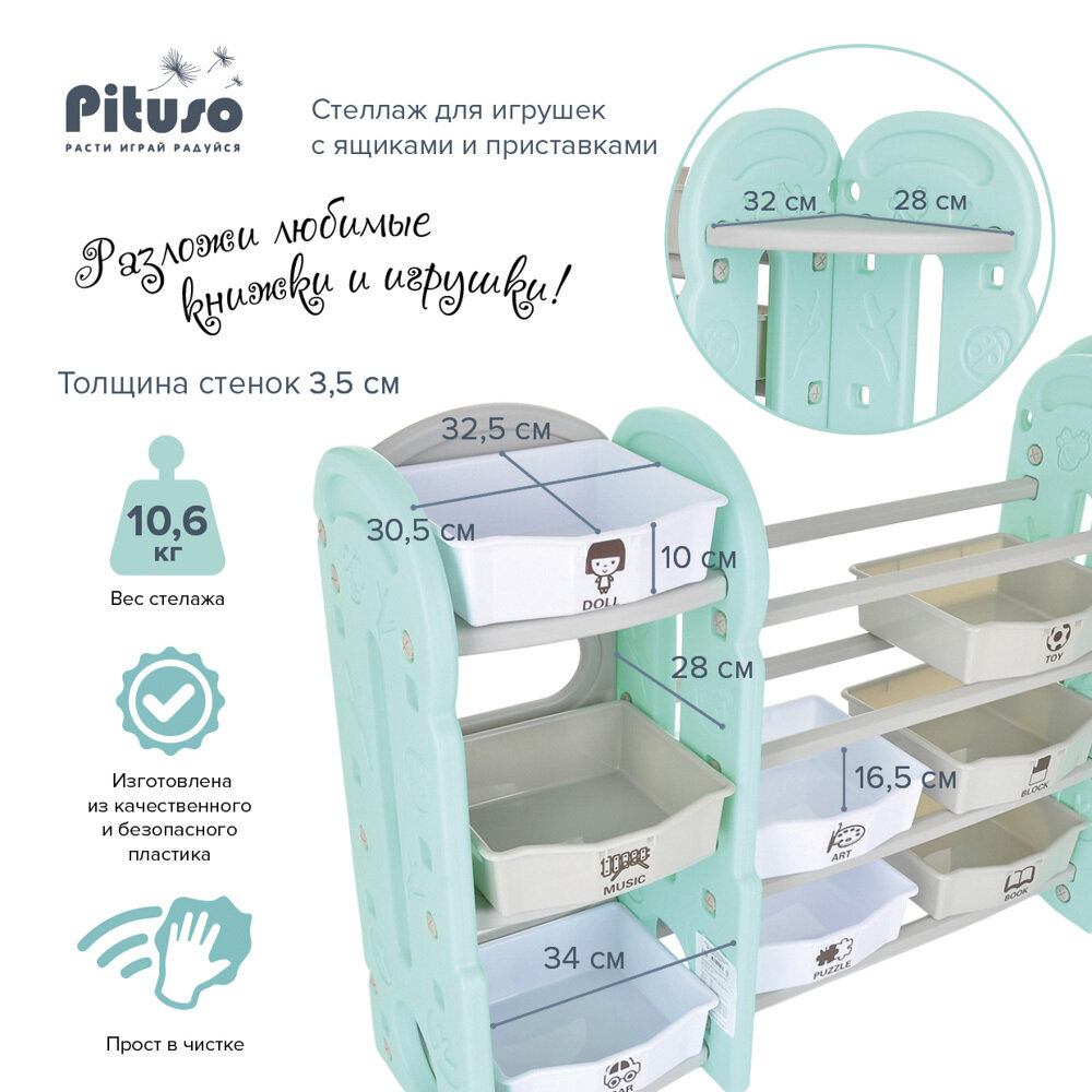 Стеллаж для игрушек с ящиками и полками выполнен из качественного пластика. Данный материал экологичен и прост в чистке. Небольшой вес стеллажа и его устойчивая конструкция обеспечивают ребёнку безопасность от ушибов.