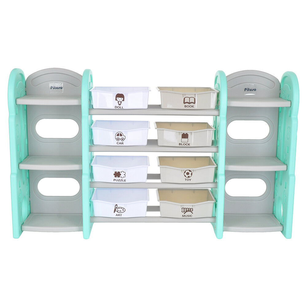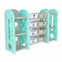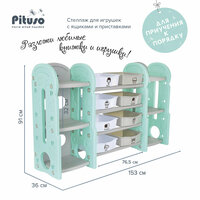 Стеллаж для игрушек с ящиками и полками выполнен из качественного пластика. Данный материал экологичен и прост в чистке. Небольшой вес стеллажа и его устойчивая конструкция обеспечивают ребёнку безопасность от ушибов.
