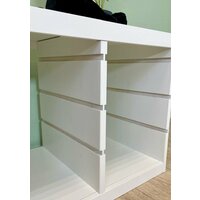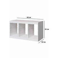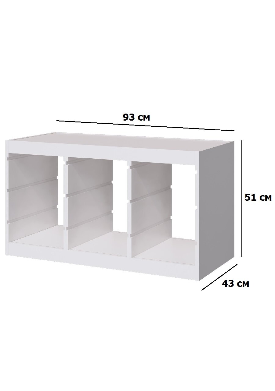Белый цвет стеллажа легко впишется в любой интерьер, а широкий ассортимент вариаций контейнеров поможет создать неповторимый дизайн комнаты. Размеры стеллажа составляют 93 см в длину, 43 см в ширину и 51 см в высоту, что позволяет разместить на нем большое количество игрушек и других предметов.