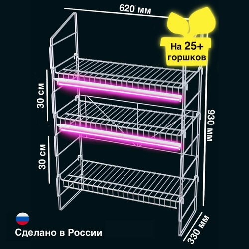 Удобный и современный Стеллаж металлический для рассады с держателями для фитолампы на окно, идеально подойдет для рассады, мини-зелени или цветов, увеличит место на подоконнике в 3 раза и не будет выделяться на фоне белого окна. Подставка идеально подойдет как для рассады так и для тяжелых горшков с цветами. Отличительная особенность этого стеллажа - регулировка расстояния между полками, что позволит удобно разместить комнатные растения разных размеров. Толщина проволоки из которой изготовлена подставка 4 мм - благодаря этому, этажерка прочная, не поддается деформации и коррозии. Мини парник на окно хорошо пропускает дневной свет для комнатных растений и фитоламп для выращивания рассады, а также обладает хорошей вентиляцией. Вы можете организовать мини огород прямо на окне с зеленым луком, редисом, петрушкой, укропом и употреблять витамины круглый год. Либо разбить красивый сад с комнатными цветами- фиалками, орхидеями или любыми другими растениями в горшках и кашпо. Стеллаж для рассады на подоконник трехъярусный приходит в разобранном виде. Для сборки подставки для цветов не нужны специальные инструменты, поэтому собрать и разобрать мини - парник можно за 5 минут. Полки можно установить на любую высоту. Максимальная нагрузка на 1 полку - 10 кг. Стеллаж металлический для растений прослужит вам долгие годы, и вы будете передавать его из поколения в поколение, так как каркас на 100% изготовлен из стальной толстой проволоки с порошковым покрытием и в отличии от стеллажа пластикового или деревянного прослужит более 10 лет. Стеллаж после высадки растений в грунт, может служить отличной полкой под обувь в прихожую или шкаф-купе, шкафчик для хранения на балкон или кладовую, или в качестве подставки под цветы на улицу на даче или огороде. Цветочник может служить в доме в качестве подставки настольной, напольной для цветов в гостиной или на веранде, органайзера и кухонного держателя для кухни, этажерки для кухни настольная или этажерка для кухни напольной , этажерки для овощей в погреб или кладовку, стеллажа для хранения вещей и обуви в прихожей, в кладовой, на балконе, в спальне, так и для сада, дачи, огорода в качестве небольшой сборной этажерки. Также парничок будет хорошим подарком на праздник для мамы, бабушки, дачников и садоводов. Общий вес стеллажа 4,7 кг. его легко собрать , разобрать и перенести с место на место.