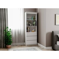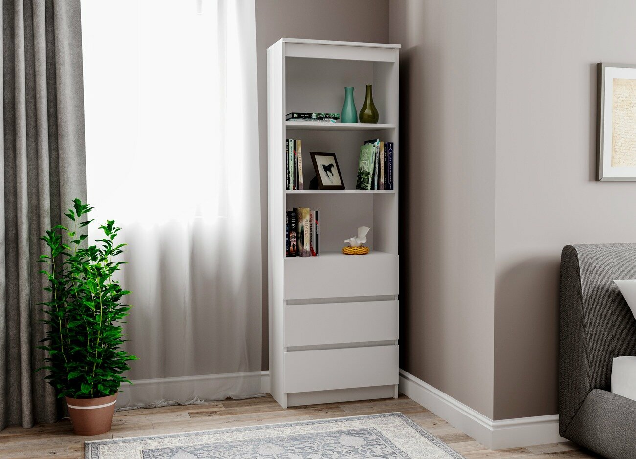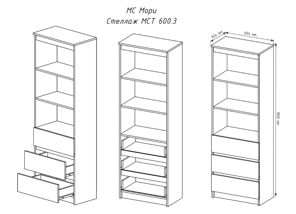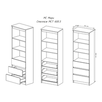 Стеллаж Мори МСТ 600.3 - небольшой, но многофункциональный современный стеллаж. Состоит из верхней части - три открытые полки, нижней части - три выдвижных ящика. На фасадах ящиков отсутствуют ручки, функцию ручек выполняет сам фасад (его верхняя часть с внутренней стороны прямая под углом 90°). Открывание ящиков производится за счет пространства между планками и фасадами.