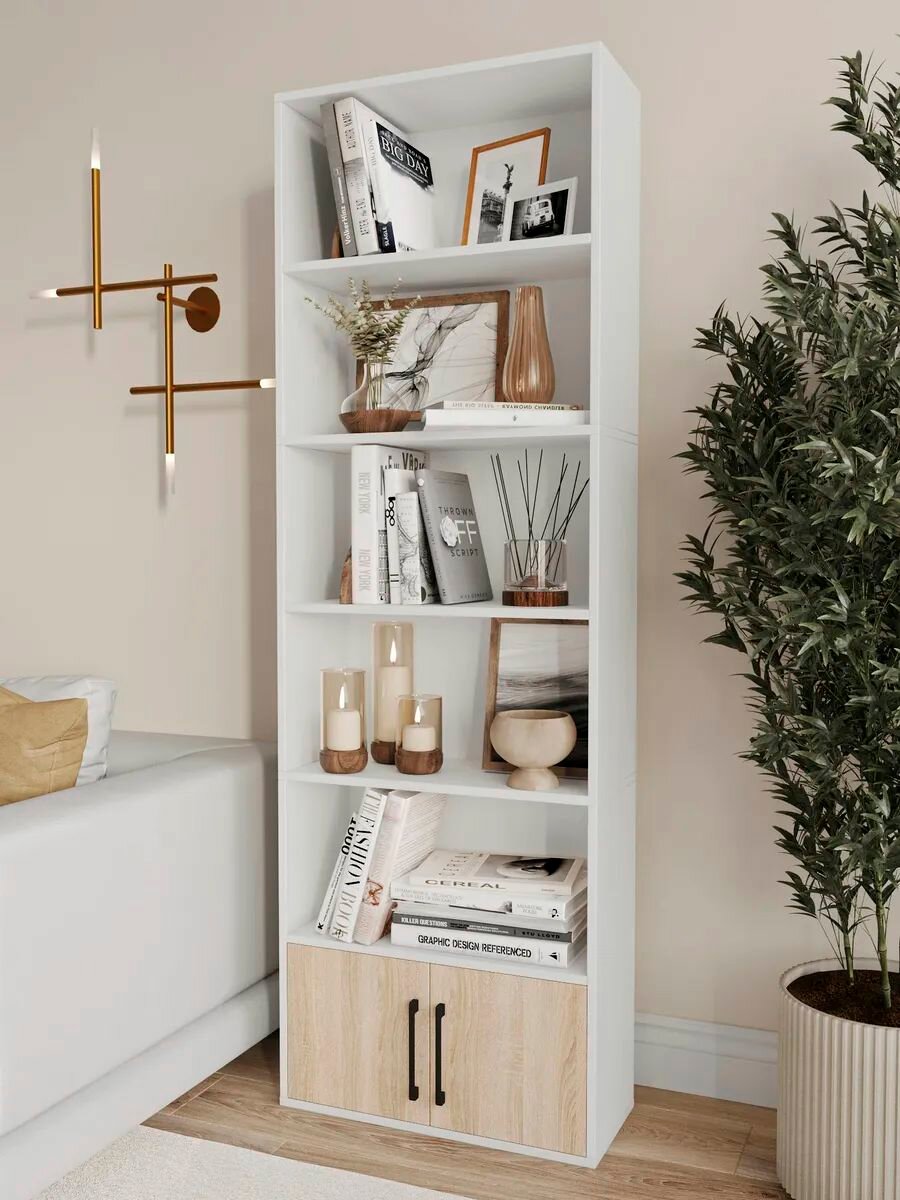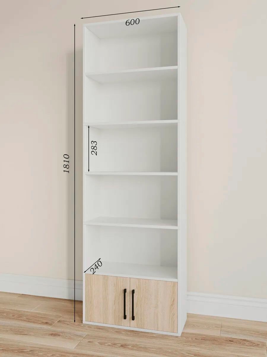 Деревянный напольный стеллаж с дверками из ламинированного ДСП цвета дуб сонома - компактный и функциональный предмет интерьера, который впишется в любую комнату вашего дома. Данная модель имеет размеры 181x60x24 см и состоит из 6 секций, каждая из которых размером 56,8x24x28,3 см. Он отлично подойдёт для хранения книг, игрушек, одежды, декоративных элементов, документов, рассады, а также станет незаменимым помощником на кухне, в гостиной, спальне, детской, прихожей, на балконе или в офисе.