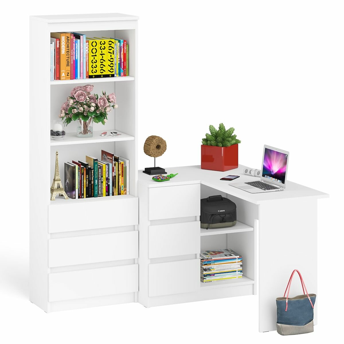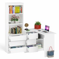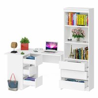 | Дополнительная информация | 2 предмета - стол и стеллаж; угловой стол Мори МС-16 левый - конструктивно тумба со столешницей образуют угол; тумба имеет 3 выдвижных ящика и нишу с полкой по середине, тумба с ящиками располагается слева; стеллаж с 2 открытыми полками сверху и 3 ящиками снизу; открывание ящиков за счет пространства между планками и фасадами, ящики на роликовых направляющих неполного выдвижения; пластиковые подпятники; поставляется в разобранном виде |