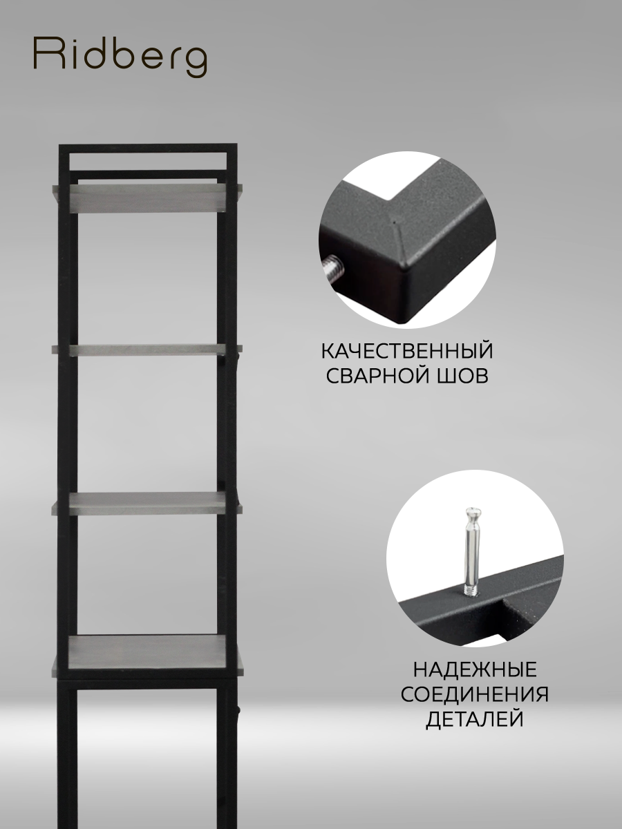 Стеллаж RIDBERG CHICAGO представляет собой стильное решение для организации пространства в современном интерьере. Прочная конструкция с металлическими опорными стенками обеспечивает исключительную надежность и устойчивость, что позволяет размещать на полках даже тяжелые предметы. Особенностью модели является сочетание индустриального стиля с практичностью: металлические стенки не только усиливают конструкцию, но и придают стеллажу характерный внешний вид, соответствующий стилю лофт. Натуральные деревянные полки добавляют уюта, гармонично сочетаясь с металлическим каркасом.