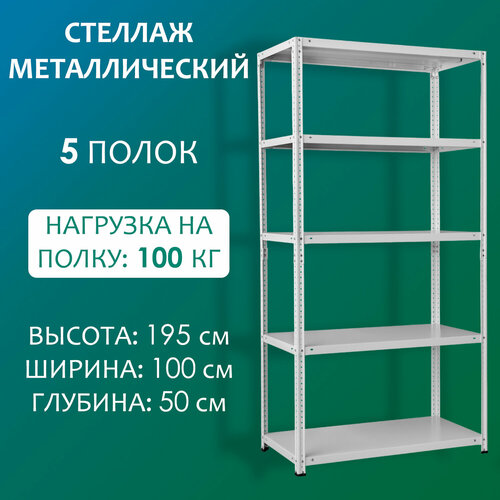Стеллаж металлический высотой 195 см, шириной 100 см и глубиной 50 см. Полный комплект крепежей (фурнитуры) поставляется в комплекте и находится внутри упаковки между полок. Стеллаж состоит из 5 металлических полок, максимальная равномерно распределенная нагрузка на каждую полку стеллажа – до 100 кг. Стойки и полки стеллажа окрашены качественной порошковой полимерной краской светло-серого цвета (RAL 7035). Стойки стеллажа сборные (каждая стойка стеллажа состоит из двух одинаковых частей, собрав их вместе получается общая высота стеллажа), благодаря чему стеллаж упакован в компактную и надежную упаковку, которая с легкостью помещается в багажник легкового автомобиля. Стеллаж собирается на надежном болтовом креплении: болт M6x12 и фланцевая гайка M6. Для сборки стеллажа потребуется ключ на 10 мм или шуруповерт с битой на 10 мм. В комплекте со стеллажом имеется 16 оцинкованных уголков жесткости, которые следует установить на 2 полки стеллажа (согласно инструкции). Данные уголки дополнительно усиливают весь стеллаж и придают ему дополнительную жесткость. Пластиковые подпятники стоек предохраняют пол от царапин. Стойки стеллажа имеют перфорацию по всей совей длине, благодаря чему полки можно устанавливать на любой нужной вам высоте с шагом регулировки в 2,5 см. Однако нижнюю полку стеллажа следует устанавливать на высоте не более 15 см от пола. Полки имеют прочную, коробчатую, цельногнутую конструкцию. Металлические полки стеллажа усилены дополнительным ребром жесткости по нижней стороне полки, а специальные отгибаемые язычки образуют полностью замкнутый профиль полки. Надежные стойки выполнены в виде сложного фигурного профиля сечением 37x37 мм. Стеллаж этажерка для хранения подойдет для дома, квартиры, гаража, балкона, дачи, сарая, офиса, склада, архива, магазина, пункта выдачи заказов и для многих других мест. Этот многофункциональный стеллаж идеально подходит для любого помещения, где нужна этажерка для хранения предметов. На складской универсальный стеллаж можно разместить большое количество различных вещей и предметов. Железный стеллаж не будет ржаветь, так как стеллаж покрашен порошковой краской. Такой стеллаж можно использовать как стеллаж для рассады на балкон.