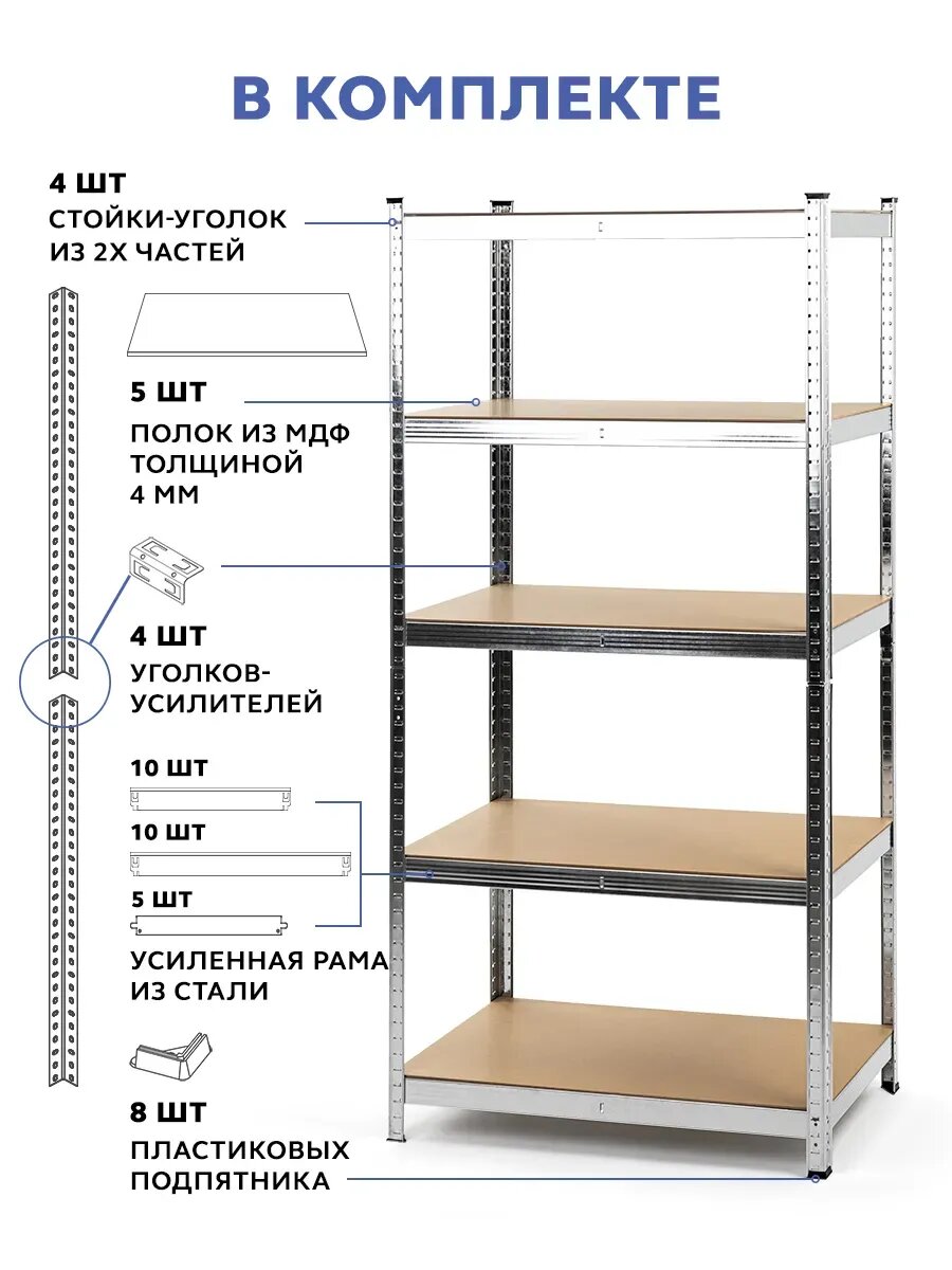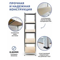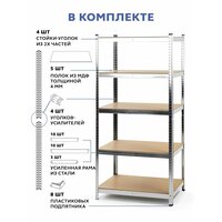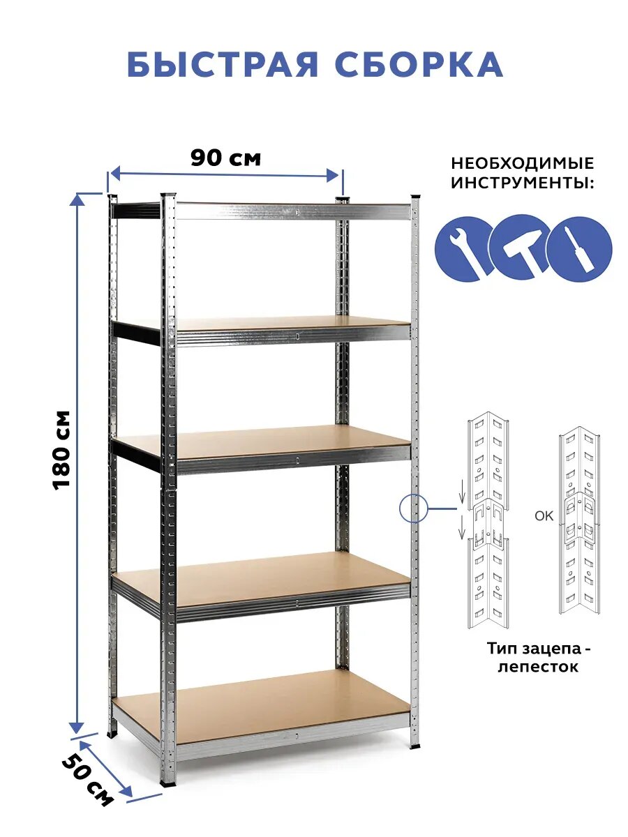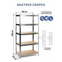 Стеллажи металлические безболтовые Gastrorag GR-001-1 180х90х50 – это универсальная 5 ярусная система хранения, которая обеспечивает оптимальную организацию пространства и наведение порядка. Используйте их для складирования различных предметов в гараже и саду, кладовой, кладовке, погребе и подсобке, на балконе и лоджии. Изделия выполнят функцию металлической мебели в стиле лофт для квартиры, дома, дачи и офиса. Они также подойдут в качестве больших торговых или складских систем для магазина, склада или ПВЗ. Стелаж лофт 5 секций можно использовать как перегородку для зонирования пространства гостиной, спальни, гардеробной и других помещений, металлического органайзера, напольной полки для хранения вещей, инструментов, домашних заготовок и консервации, подставки для обуви в прихожую, открытой этажерки для одежды, книг и игрушек, книжного шкафа, кухонной стойки для посуды или полочки для микроволновки на кухню. В садоводстве он пригодится под рассаду, комнатные цветы и садовые растения. Он также сможет послужить офисной мебелью для хранения архивных папок с документами и размещения оргтехники. Железный не окрашенный хозяйственный шкаф поставляется в разобранном виде. Многофункциональный трансформер укомплектован четырьмя вертикальными стойками, которые состоят из двух частей. Благодаря этому вы сможете собрать как один стеллаж высотой 180 см с 5 отделениями, так и 2 стеллажа высотой 90 см с 2 и 3 полками. Каркас изготовлен из полированной оцинкованной стали, устойчивой к коррозии. Толщина металла 0.62 мм. Материал полок - влагостойкий МДФ без покрытия толщиной 4 мм, который может в течение длительного времени выдерживать повышенную влажность воздуха. Его можно размещать и в ванной комнате, однако прямого попадания жидкости на поверхность следует избегать. Сборный высокий шкаф 5 ярусов имеет практичное безболтовое соединение (тип крепления - лепесток) и легко собирается при помощи деревянной или резиновой киянки, лепестки при необходимости можно слегка отогнуть отверткой. В комплект входят пластиковые подпятники, которые предохраняют пол от повреждений. При правильной сборке, когда все лепестки вставлены в обе парные прорези, конструкция становится прочной, надежной и отличается долговечностью. Нагрузка на полку - до 175 кг, на весь стелаж - до 875 кг. Ширина полочки 90, глубина 50 см. Высота полок регулируется с шагом 30 мм. Изделие является сборно разборным, в конце сезона рассады его можно разобрать и убрать до следующего года. В целях обеспечения дополнительной прочности и устойчивости рекомендуется ставить его вплотную к стене и дополнительно крепить к стене.