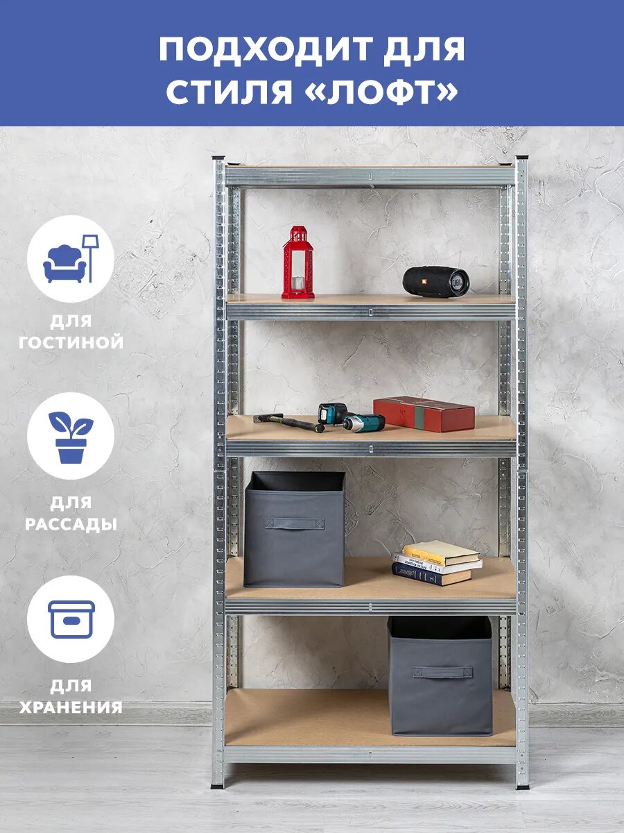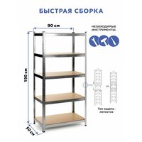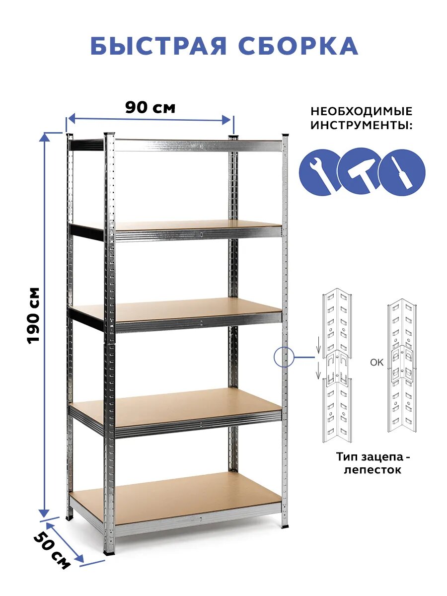 Стеллажи металлические безболтовые Gastrorag GR-001-1 190х90х50 – это универсальная 5 ярусная система хранения, которая обеспечивает оптимальную организацию пространства и наведение порядка. Используйте их для складирования различных предметов в гараже и саду, кладовой, кладовке, погребе и подсобке, на балконе и лоджии. Изделия выполнят функцию металлической мебели в стиле лофт для квартиры, дома, дачи и офиса. Они также подойдут в качестве больших торговых или складских систем для магазина, склада или ПВЗ. Стелаж лофт 5 секций можно использовать как перегородку для зонирования пространства гостиной, спальни, гардеробной и других помещений, металлического органайзера, напольной полки для хранения вещей, инструментов, домашних заготовок и консервации, подставки для обуви в прихожую, открытой этажерки для одежды, книг и игрушек, книжного шкафа, кухонной стойки для посуды или полочки для микроволновки на кухню. В садоводстве он пригодится под рассаду, комнатные цветы и садовые растения. Он также сможет послужить офисной мебелью для хранения архивных папок с документами и размещения оргтехники. Железный не окрашенный хозяйственный шкаф поставляется в разобранном виде. Многофункциональный трансформер укомплектован четырьмя вертикальными стойками, которые состоят из двух частей. Благодаря этому вы сможете собрать как один стеллаж высотой 190 см с 5 отделениями, так и 2 стеллажа высотой 95 см с 2 и 3 полками. Каркас изготовлен из полированной оцинкованной стали, устойчивой к коррозии. Толщина металла 0.62 мм. Материал полок - влагостойкий МДФ без покрытия толщиной 4 мм, который может в течение длительного времени выдерживать повышенную влажность воздуха. Его можно размещать и в ванной комнате, однако прямого попадания жидкости на поверхность следует избегать. Сборный высокий шкаф 5 ярусов имеет практичное безболтовое соединение (тип крепления - лепесток) и легко собирается при помощи деревянной или резиновой киянки, лепестки при необходимости можно слегка отогнуть отверткой. В комплект входят пластиковые подпятники, которые предохраняют пол от повреждений. При правильной сборке, когда все лепестки вставлены в обе парные прорези, конструкция становится прочной, надежной и отличается долговечностью. Нагрузка на полку - до 175 кг, на весь стелаж - до 875 кг. Ширина полочки 90, глубина 50 см. Высота полок регулируется с шагом 30 мм. Изделие является сборно разборным, в конце сезона рассады его можно разобрать и убрать до следующего года. В целях обеспечения дополнительной прочности и устойчивости рекомендуется ставить его вплотную к стене и дополнительно крепить к стене.