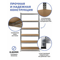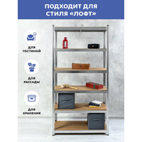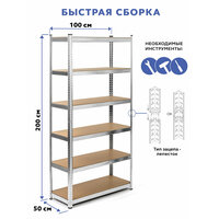 Стеллажи металлические безболтовые Gastrorag GR-001-1 размером 200х100х50 см – это универсальная 6 ярусная система хранения различных предметов для гаража и сада, кладовой, кладовки и подсобки, балкона и лоджии, металлическая мебель в стиле лофт для квартиры, дома, дачи и офиса. Они также подойдут в качестве больших торговых или складских стеллажей для магазина. Стеллаж лофт 6 секций можно использовать в качестве перегородки для зонирования пространства гостиной, спальни и гардеробной, металлического органайзера, напольной полки для хранения вещей, инструментов, домашних заготовок и консервации, подставки для обуви в прихожую, открытого шкафа для одежды, книг и игрушек, кухонного стеллажа для посуды или полки для микроволновки на кухню. В садоводстве он пригодится в качестве стеллажа под рассаду, этажерки для комнатных цветов и растений. Ему найдется применение и в качестве офисной мебели для хранения папок с документами и размещения оргтехники. Железный не окрашенный стеллаж поставляется в разобранном виде. Стеллаж трансформер укомплектован стойками, которые состоят из двух частей. Благодаря этому вы сможете собрать как один стеллаж высотой 200 см с 6 полками, так и 2 стеллажа высотой 100 см с 3 полками. Стойки и рамы полок изготовлены из полированной оцинкованной стали толщиной 0.62 мм, полки - из влагостойкого МДФ толщиной 4 мм. Влагостойкий МДФ может в течение длительного времени выдерживать повышенную влажность воздуха, поэтому стеллаж можно использовать и для ванной комнаты, однако прямого попадания жидкости на его поверхность следует избегать. Сборный стеллаж 6 ярусов имеет практичное безболтовое соединение (тип зацепа - лепесток) и легко собирается при помощи деревянной или резиновой киянки, лепестки при необходимости можно слегка отогнуть отверткой. Пластиковые подпятники предохраняют пол от повреждений. Нагрузка на полку - до 150 кг, на весь стеллаж - до 900 кг. Длина полочки 100 см, ширина 50 см. Высота полок регулируется с шагом 3 см. В целях обеспечения устойчивости рекомендуется ставить стеллаж вплотную к стене и дополнительно крепить его к стене.