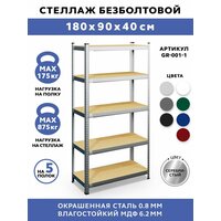 Стеллажи металлические безболтовые Gastrorag GR-001-1 размером 180х90х40 см – это универсальная 5-ярусная система хранения различных предметов для гаража и сада, кладовой, кладовки и подсобки, балкона и лоджии, металлическая мебель в стиле лофт для квартиры, дома, дачи и офиса. Они также подойдут в качестве больших торговых или складских стеллажей для магазина. Стеллаж лофт можно использовать в качестве перегородки для зонирования пространства гостиной, спальни и гардеробной, металлического органайзера, напольной полки для хранения вещей, инструментов, домашних заготовок и консервации, подставки для обуви в прихожую, открытого шкафа для одежды, книг и игрушек, кухонного стеллажа для посуды или полки для микроволновки на кухню. В садоводстве он пригодится в качестве стеллажа под рассаду, этажерки для комнатных цветов и растений. Ему найдется применение и в качестве офисной мебели для хранения папок с документами и размещения оргтехники. Железный не окрашенный стеллаж поставляется в разобранном виде. Стеллаж трансформер укомплектован стойками, которые состоят из двух частей. Благодаря этому вы сможете собрать как один стеллаж высотой 180 см с 5 полками, так и 2 стеллажа высотой 90 см с 2 и 3 полками. Стойки и рамы полок изготовлены из полированной оцинкованной стали толщиной 0.62 мм, полки - из влагостойкого МДФ толщиной 4 мм. Влагостойкий МДФ может в течение длительного времени выдерживать повышенную влажность воздуха, поэтому стеллаж можно использовать и для ванной комнаты, однако прямого попадания жидкости на его поверхность следует избегать. Сборный стеллаж имеет практичное безболтовое соединение (тип зацепа - лепесток) и легко собирается при помощи деревянной или резиновой киянки, лепестки при необходимости можно слегка отогнуть отверткой. Пластиковые подпятники предохраняют пол от повреждений. Нагрузка на полку - до 175 кг, на весь стеллаж - до 875 кг. Длина полочки 90 см, ширина 40 см. Высота полок регулируется с шагом 30 мм. В целях обеспечения устойчивости рекомендуется ставить стеллаж вплотную к стене и дополнительно крепить его к стене.
