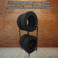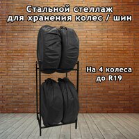 Стеллаж занимает всего 0,2 кв. м площади пола, но в нем умещается 4 колеса размером R13-R19. На нижний ярус входят колеса высотой до 750 см, на верхний - без ограничений. Максимальная ширина одной покрышки, чтобы уместилось два колеса на одном ярусе - 250 мм.