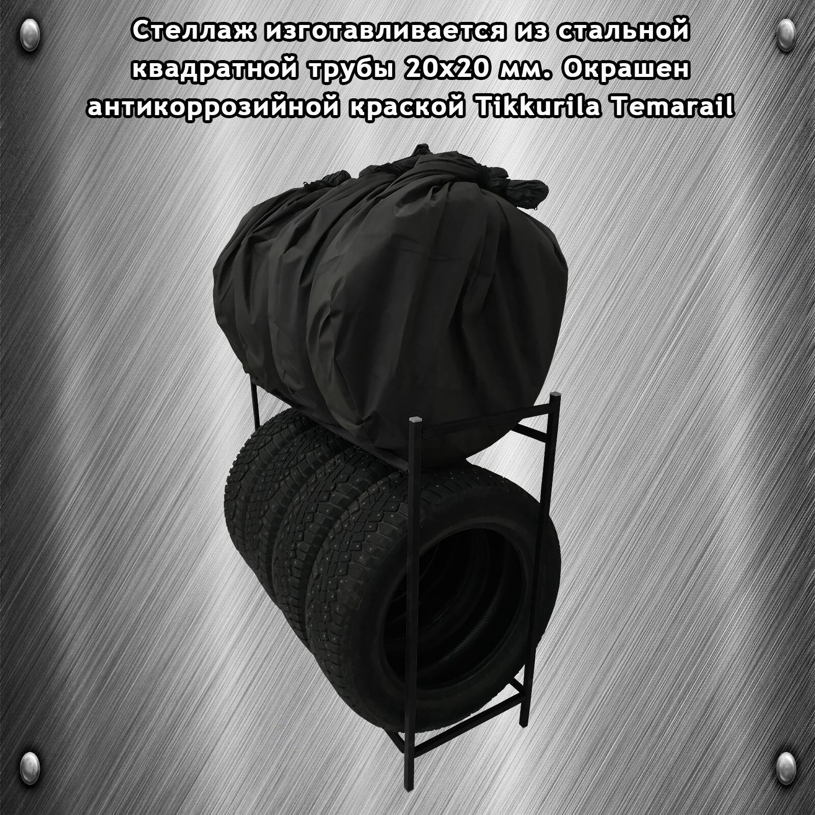 В этот стеллаж умещается 8 колес размером до R23 - по 4 колеса на каждом ярусе. Чтобы убедиться, что ваше колесо войдет на нижний уровень, измерьте рулеткой высоту вашего вертикально стоящего накаченного колеса. На нижний ярус входят колеса высотой до 950 мм, на верхний - без ограничений. Максимальная ширина одной покрышки, чтобы уместилось четыре колеса на одном ярусе - 300 мм.